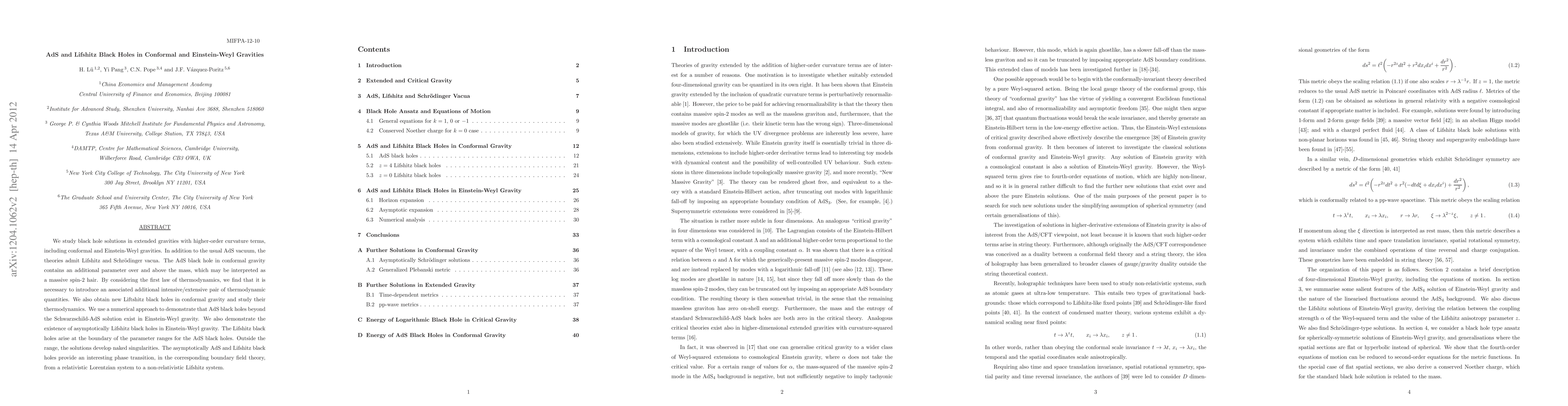 We study black hole solutions in extended gravities with higher-order curvature terms, including conformal and Einstein-Weyl gravities. In addition to the usual AdS vacuum, the theories admit Lifshitz and Schr\"odinger vacua. The AdS black hole in conformal gravity contains an additional parameter over and above the mass, which may be interpreted as a massive spin-2 hair. By considering the first law of thermodynamics, we find that it is necessary to introduce an associated additional intensive/extensive pair of thermodynamic quantities. We also obtain new Liftshitz black holes in conformal gravity and study their thermodynamics. We use a numerical approach to demonstrate that AdS black holes beyond the Schwarzschild-AdS solution exist in Einstein-Weyl gravity. We also demonstrate the existence of asymptotically Lifshitz black holes in Einstein-Weyl gravity. The Lifshitz black holes arise at the boundary of the parameter ranges for the AdS black holes. Outside the range, the solutions develop naked singularities. The asymptotically AdS and Lifshitz black holes provide an interesting phase transition, in the corresponding boundary field theory, from a relativistic Lorentzian system to a non-relativistic Lifshitz system.