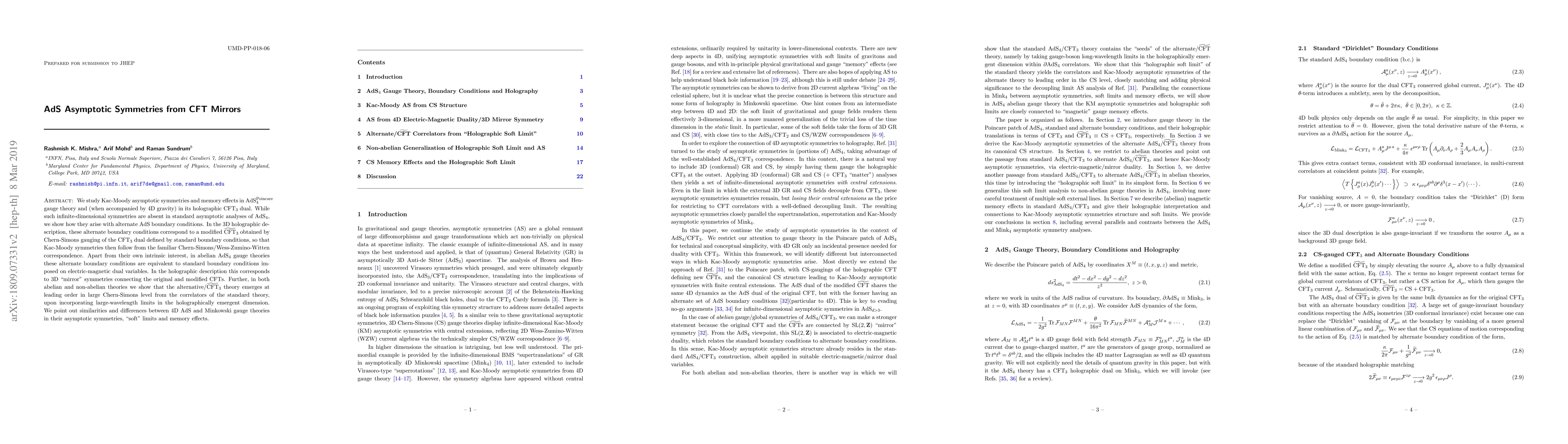 We study Kac-Moody asymptotic symmetries and memory effects in $\text{AdS}_4^{\text{Poincare}}$ gauge theory and (when accompanied by 4D gravity) in its holographic CFT$_3$ dual. While such infinite-dimensional symmetries are absent in standard asymptotic analyses of $\text{AdS}_4$, we show how they arise with alternate AdS boundary conditions. In the 3D holographic description, these alternate boundary conditions correspond to a modified $\widetilde{\text{CFT}}_3$ obtained by Chern-Simons gauging of the CFT$_3$ dual defined by standard boundary conditions, so that Kac-Moody symmetries then follow from the familiar Chern-Simons/Wess-Zumino-Witten correspondence. Apart from their own intrinsic interest, in abelian $\text{AdS}_4$ gauge theories these alternate boundary conditions are equivalent to standard boundary conditions imposed on electric-magnetic dual variables. In the holographic description this corresponds to 3D "mirror" symmetries connecting the original and modified CFTs. Further, in both abelian and non-abelian theories we show that the alternative/$\widetilde{\text{CFT}}_3$ theory emerges at leading order in large Chern-Simons level from the correlators of the standard theory, upon incorporating large-wavelength limits in the holographically emergent dimension. We point out similarities and differences between 4D AdS and Minkowski gauge theories in their asymptotic symmetries, "soft" limits and memory effects.