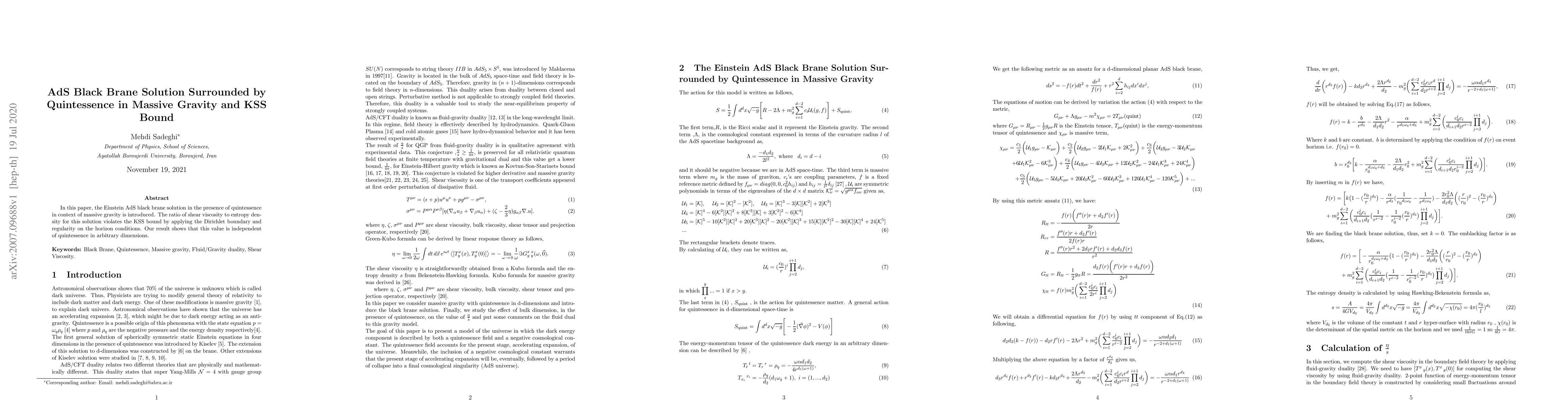 This paper introduces an AdS black brane solution in massive gravity with quintessence, demonstrating that the ratio of shear viscosity to entropy density violates the KSS bound. The result indicates that this ratio is quintessence-independent in any dimension.