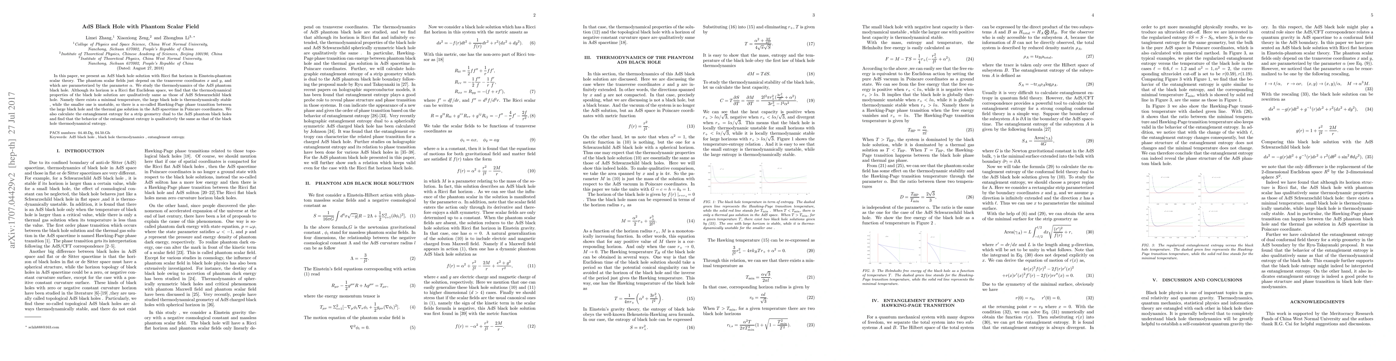 The paper presents an AdS black hole solution with a Ricci flat horizon in Einstein-phantom scalar theory, where phantom scalar fields depend on transverse coordinates x and y, parameterized by α. The thermodynamics and entanglement entropy of this black hole are studied and compared with AdS Schwarzschild black hole properties.