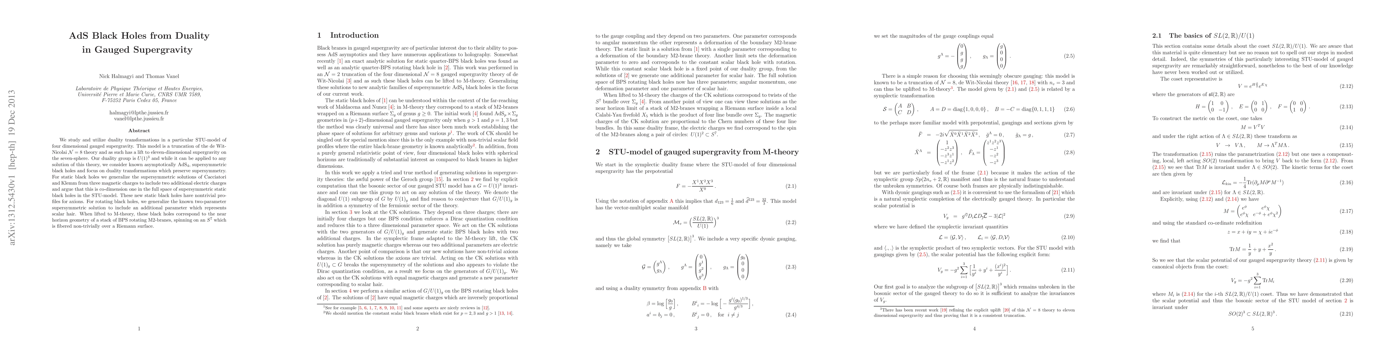 We study and utilize duality transformations in a particular STU-model of four dimensional gauged supergravity. This model is a truncation of the de Wit-Nicolai N=8 theory and as such has a lift to eleven-dimensional supergravity on the seven-sphere. Our duality group is $U(1)^3$ and while it can be applied to any solution of this theory, we consider the known asymptotically AdS$_4$, supersymmetric black holes and focus on duality transformations which preserve supersymmetry. For static black holes we generalize the supersymmetric solutions of Cacciatori and Klemm from three magnetic charges to include two additional electric charges and argue that this is co-dimension one in the full space of supersymmetric static black holes in the STU-model. These new static black holes have nontrivial profiles for axions. For rotating black holes, we generalize the known two-parameter supersymmetric solution to include an additional parameter which represents scalar hair. When lifted to M-theory, these black holes correspond to the near horizon geometry of a stack of BPS rotating M2-branes, spinning on an $S^7$ which is fibered non-trivially over a Riemann surface.