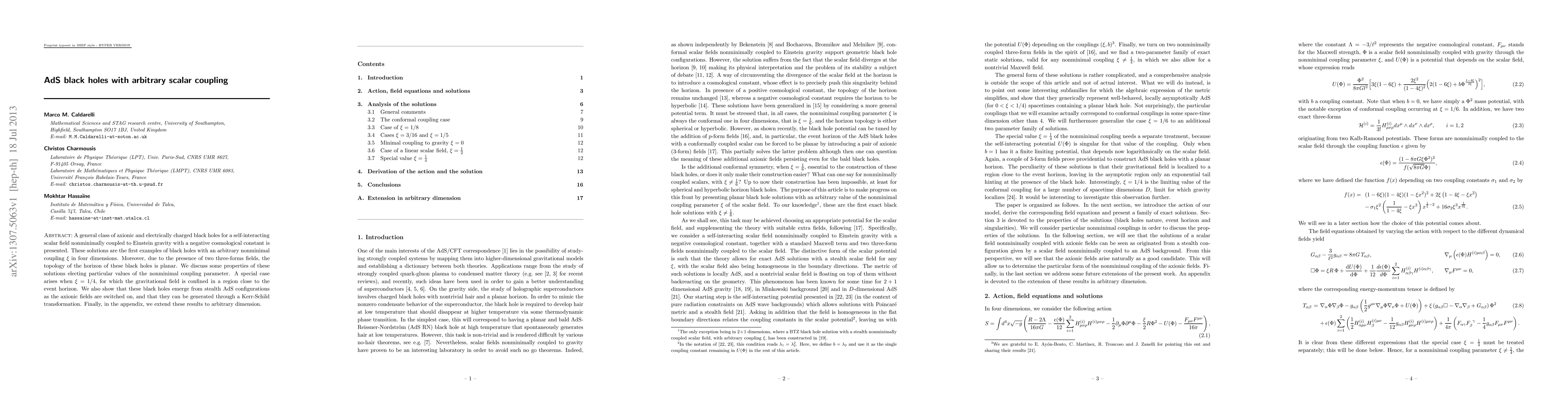 A general class of axionic and electrically charged black holes for a self-interacting scalar field nonminimally coupled to Einstein gravity with a negative cosmological constant is presented. These solutions are the first examples of black holes with an arbitrary nonminimal coupling $\xi$ in four dimensions. Moreover, due to the presence of two three-forms fields, the topology of the horizon of these black holes is planar. We discuss some properties of these solutions electing particular values of the nonminimal coupling parameter. A special case arises when $\xi=1/4$, for which the gravitational field is confined in a region close to the event horizon. We also show that these black holes emerge from stealth AdS configurations as the axionic fields are switched on, and that they can be generated through a Kerr-Schild transformation. Finally, in the appendix, we extend these results to arbitrary dimension.
