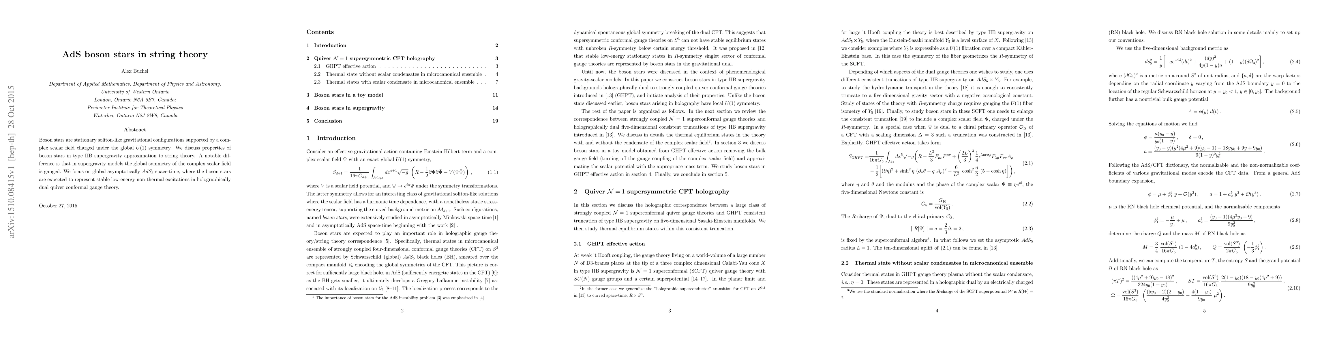 Boson stars are stationary soliton-like gravitational configurations supported by a complex scalar field charged under the global $U(1)$ symmetry. We discuss properties of boson stars in type IIB supergravity approximation to string theory. A notable difference is that in supergravity models the global symmetry of the complex scalar field is gauged. We focus on global asymptotically $AdS_5$ space-time, where the boson stars are expected to represent stable low-energy non-thermal excitations in holographically dual quiver conformal gauge theory.