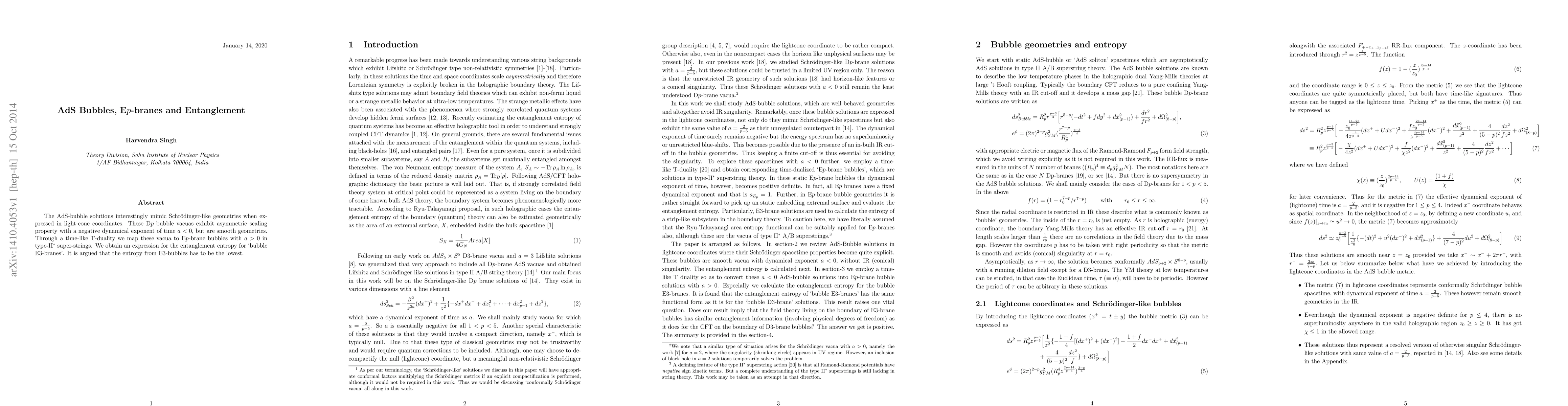 This paper explores AdS-bubble solutions that resemble Schrödinger-like geometries in light-cone coordinates, mapping them to E$p$-brane bubbles via time-like T-duality. It derives an expression for the entanglement entropy of E3-brane bubbles, arguing that this entropy is the lowest possible.