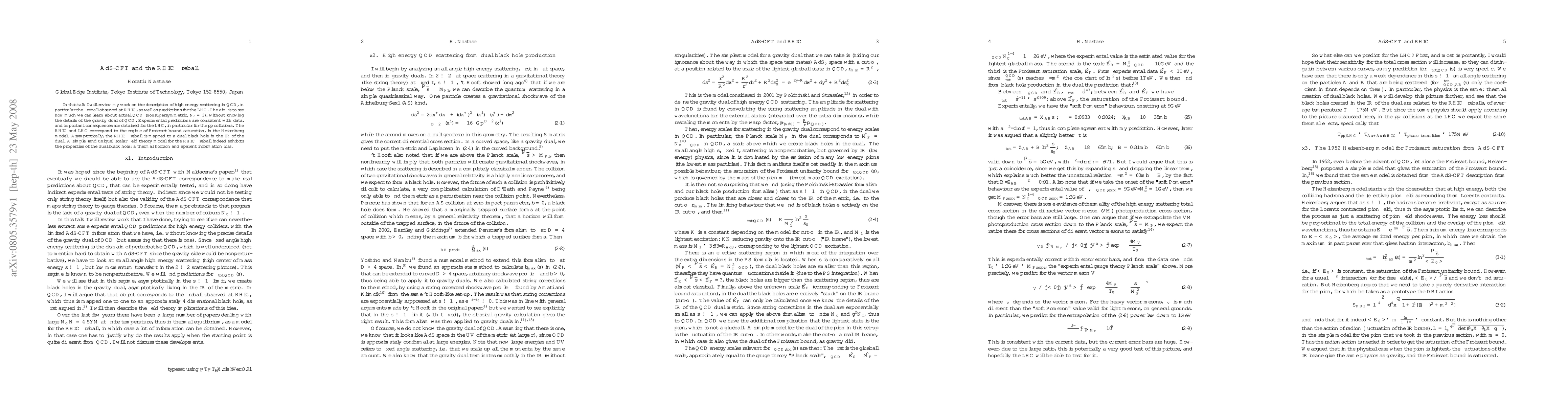 In this talk I will review my work on the description of high energy scattering in QCD, in particular the fireball observed at RHIC, as well as predictions for the LHC. The aim is to see how much we can learn about actual QCD (nonsupersymmetric, $N_c=3$), without knowing the details of the gravity dual of QCD. Experimental predictions are consistent with data, and important consequences are obtained for the LHC, in particular for the $pp$ collisions. The RHIC and LHC correspond to the regime of Froissart bound saturation, in the Heisenberg model. Asymptotically, the RHIC fireball is mapped to a dual black hole in the IR of the dual. A simple (and unique) scalar field theory model for the RHIC fireball indeed exhibits the properties of the dual black hole: a thermal horizon and aparent information loss.