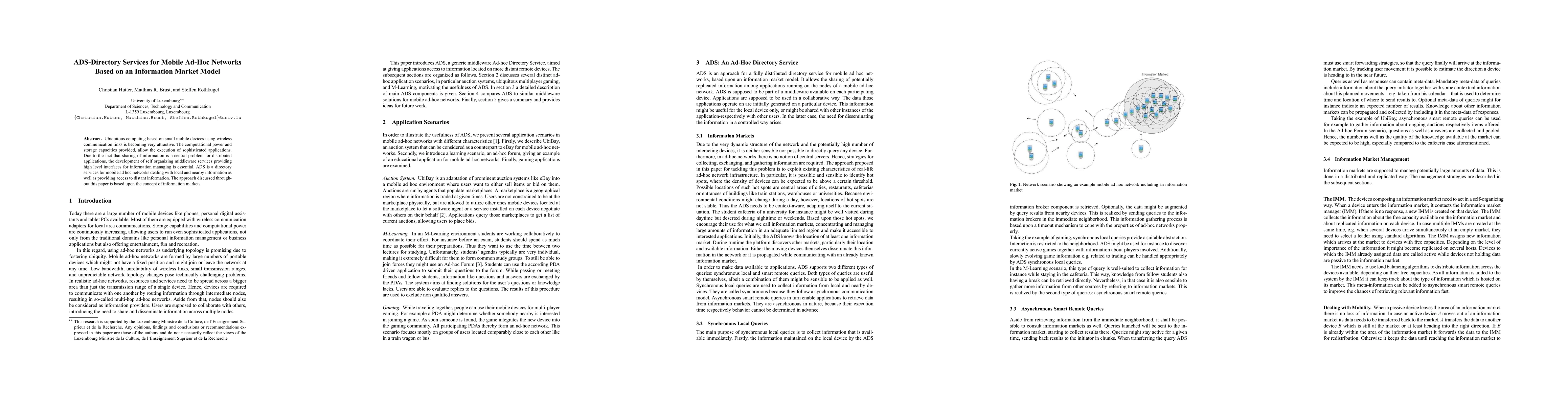 This paper introduces an ADS directory service for mobile ad-hoc networks that utilizes an information market model to manage local and distant information sharing. It provides a high-level interface for managing information in distributed applications.