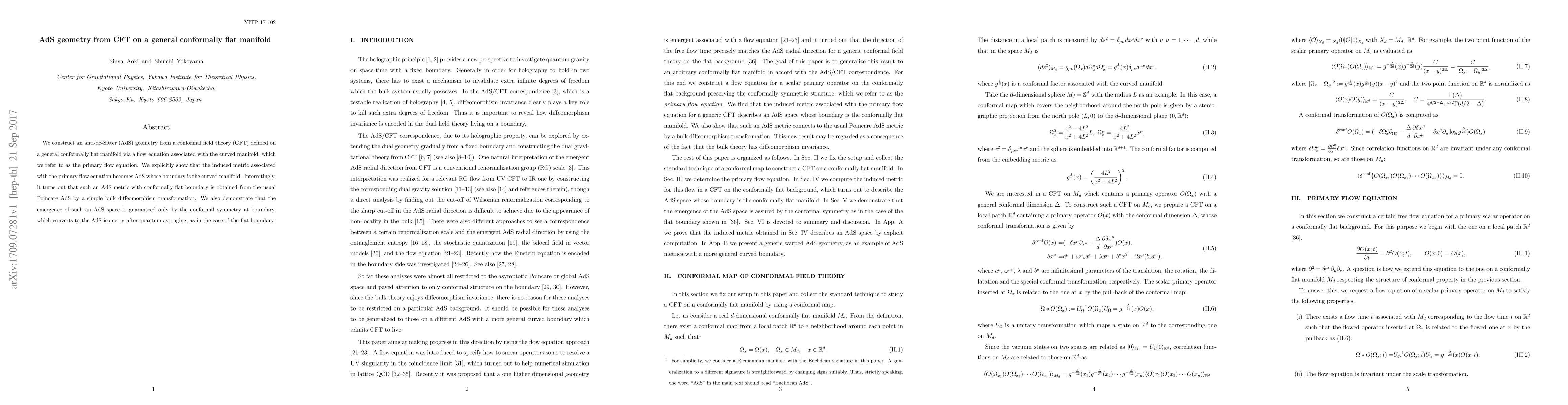 This paper constructs an AdS geometry from a conformal field theory on a conformally flat manifold using a primary flow equation, showing that the induced metric becomes AdS with the curved manifold as its boundary. The resulting AdS space is obtained from the usual Poincaré AdS via a bulk diffeomorphism, and its emergence is ensured by boundary conformal symmetry converting to AdS isometry through quantum averaging.