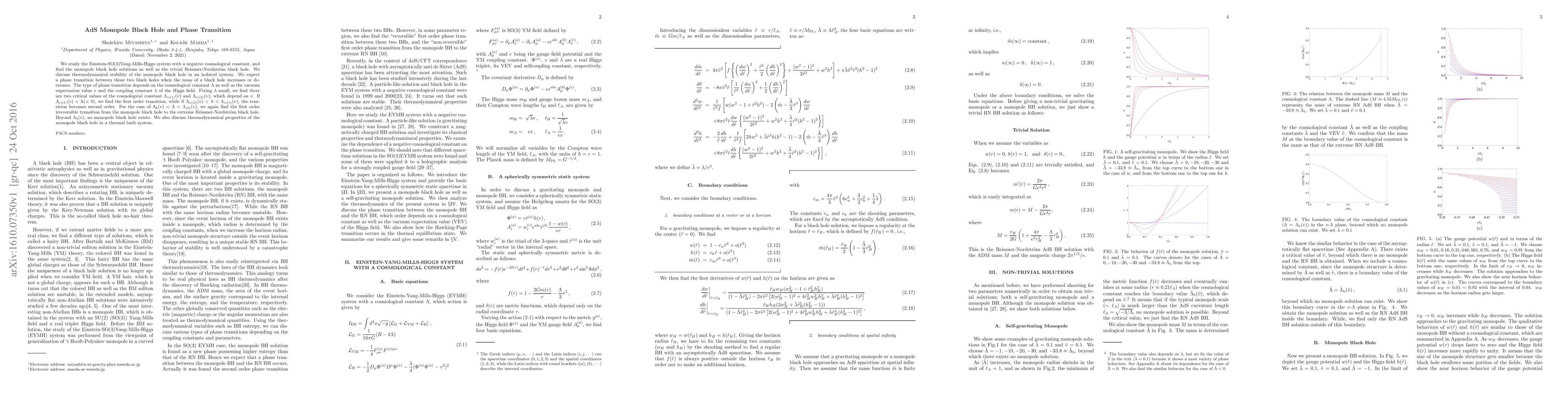 We study the Einstein-SO(3)Yang-Mills-Higgs system with a negative cosmological constant, and find the monopole black hole solutions as well as the trivial Reissner-Nordstr\"{o}m black hole. We discuss thermodynamical stability of the monopole black hole in an isolated system. We expect a phase transition between those two black holes when the mass of a black hole increases or decreases. The type of phase transition depends on the cosmological constant $\Lambda$ as well as the vacuum expectation value $v$ and the coupling constant $\lambda$ of the Higgs field. Fixing $\lambda$ small, we find there are two critical values of the cosmological constant $\Lambda_{\rm cr (1)}(v)$ and $\Lambda_{\rm cr(2)}(v)$, which depend on $v$. If $\Lambda_{\rm cr(1)}(v)<\Lambda (<0)$, we find the first order transition, while if $\Lambda_{\rm cr(2)}(v)<\Lambda<\Lambda_{\rm cr(1)}(v)$, the transition becomes second order. For the case of $\Lambda_{b}(v)<\Lambda<\Lambda_{\rm (2)}(v)$, we again find the first order irreversible transition from the monopole black hole to the extreme Reissner-Nordstr\"{o}m black hole. Beyond $\Lambda_{b}(v)$, no monopole black hole exists. We also discuss thermodynamical properties of the monopole black hole in a thermal bath system.