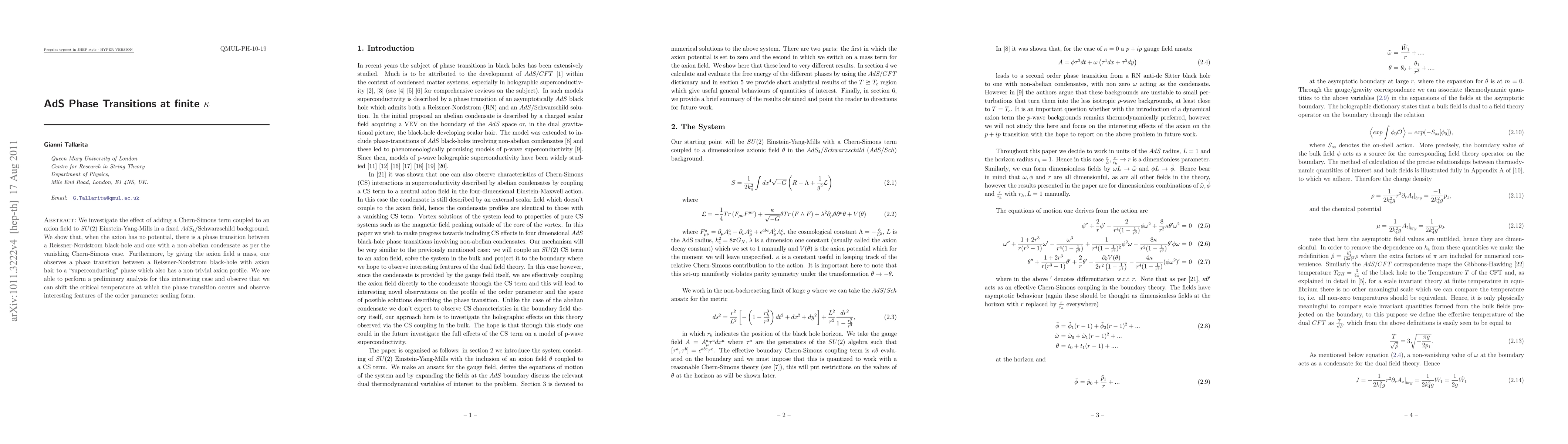 We investigate the effect of adding a Chern-Simons term coupled to an axion field to SU(2) Einstein-Yang-Mills in a fixed $AdS_4$/Schwarzschild background. We show that, when the axion has no potential, there is a phase transition between a Reissner-Nordstrom black-hole and one with a non-abelian condensate as per the vanishing Chern-Simons case. Furthermore, by giving the axion field a mass, one observes a phase transition between a Reissner-Nordstrom black-hole with axion hair to a "superconducting" phase which also has a non-trivial axion profile. We are able to perform a preliminary analysis for this interesting case and observe that we can shift the critical temperature at which the phase transition occurs and observe interesting features of the order parameter scaling form.