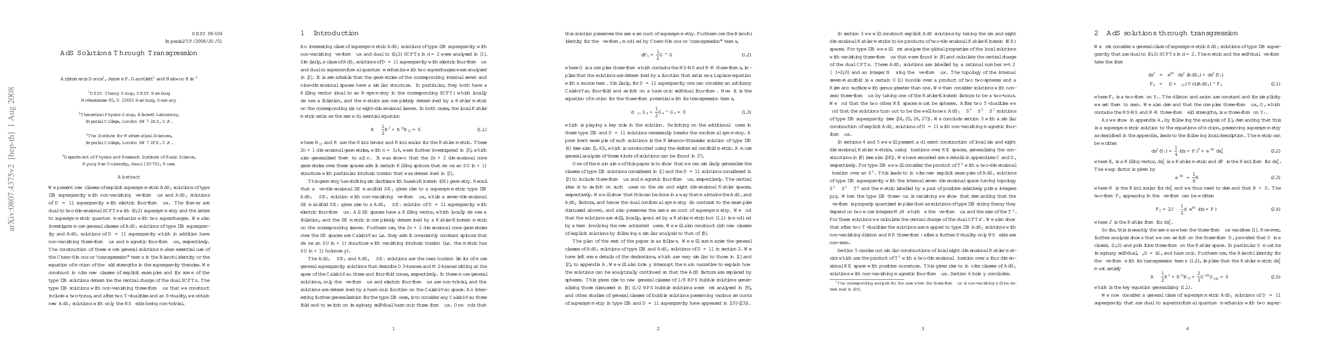 We present new classes of explicit supersymmetric AdS_3 solutions of type IIB supergravity with non-vanishing five-form flux and AdS_2 solutions of D=11 supergravity with electric four-form flux. The former are dual to two-dimensional SCFTs with (0,2) supersymmetry and the latter to supersymmetric quantum mechanics with two supercharges. We also investigate more general classes of AdS_3 solutions of type IIB supergravity and AdS_2 solutions of D=11 supergravity which in addition have non-vanishing three-form flux and magnetic four-form flux, respectively. The construction of these more general solutions makes essential use of the Chern-Simons or "transgression" terms in the Bianchi identity or the equation of motion of the field strengths in the supergravity theories. We construct infinite new classes of explicit examples and for some of the type IIB solutions determine the central charge of the dual SCFTs. The type IIB solutions with non-vanishing three-form flux that we construct include a two-torus, and after two T-dualities and an S-duality, we obtain new AdS_3 solutions with only the NS fields being non-trivial.