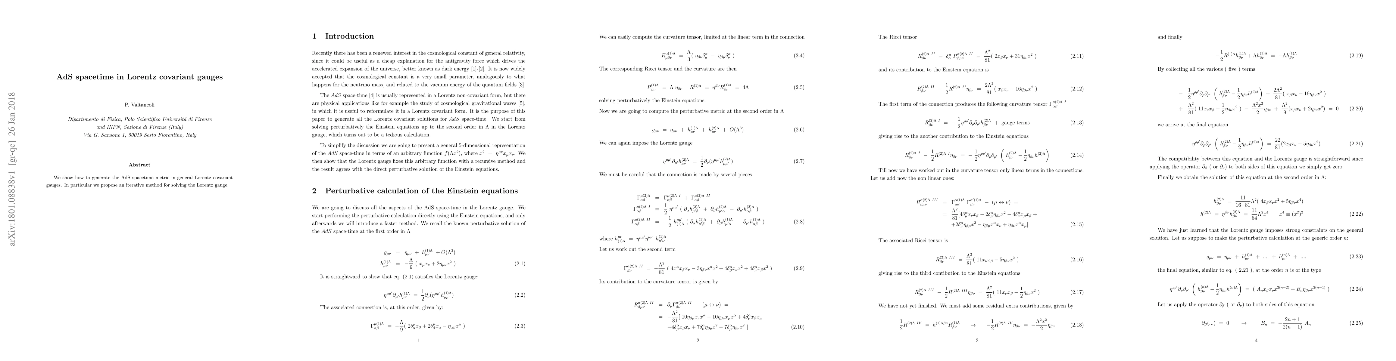 Summary: This paper presents an iterative method for generating the AdS spacetime metric in Lorentz covariant gauges, focusing on solving the Lorentz gauge through a proposed iterative technique. The approach aims to achieve a more generalized understanding of AdS space within these gauges.