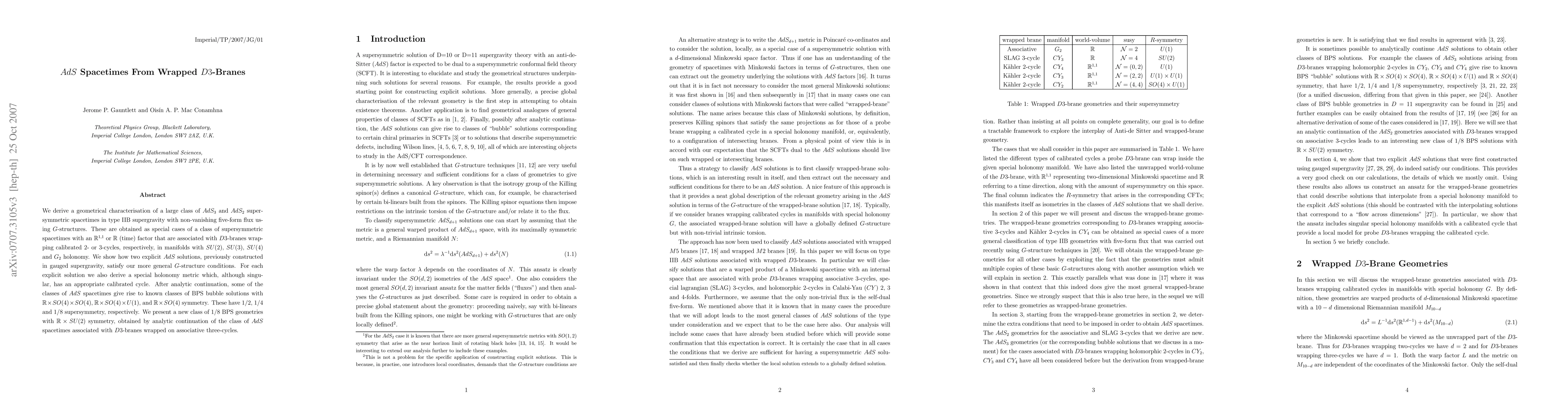 We derive a geometrical characterisation of a large class of AdS_3 and AdS_2 supersymmetric spacetimes in IIB supergravity with non-vanishing five-form flux using G-structures. These are obtained as special cases of a class of supersymmetric spacetimes with an $\mathbb{R}^{1,1}$ or $\mathbb{R}$ (time) factor that are associated with D3-branes wrapping calibrated 2- or 3- cycles, respectively, in manifolds with SU(2), SU(3), SU(4) and G_2 holonomy. We show how two explicit AdS solutions, previously constructed in gauged supergravity, satisfy our more general G-structure conditions. For each explicit solution we also derive a special holonomy metric which, although singular, has an appropriate calibrated cycle. After analytic continuation, some of the classes of AdS spacetimes give rise to known classes of BPS bubble solutions with $\mathbb{R}\times SO(4)\times SO(4)$, $\mathbb{R}\times SO(4)\times U(1)$, and $\mathbb{R}\times SO(4)$ symmetry. These have 1/2, 1/4 and 1/8 supersymmetry, respectively. We present a new class of 1/8 BPS geometries with $\mathbb{R}\times SU(2)$ symmetry, obtained by analytic continuation of the class of AdS spacetimes associated with D3-branes wrapped on associative three-cycles.