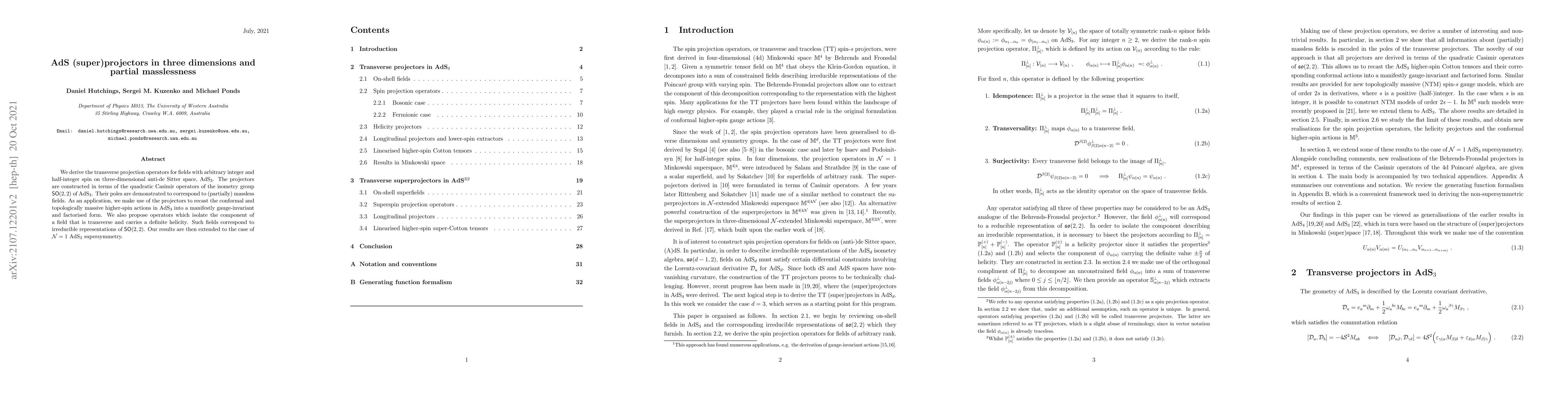 We derive the transverse projection operators for fields with arbitrary integer and half-integer spin on three-dimensional anti-de Sitter space, AdS$_3$. The projectors are constructed in terms of the quadratic Casimir operators of the isometry group $\mathsf{SO}(2,2)$ of AdS$_3$. Their poles are demonstrated to correspond to (partially) massless fields. As an application, we make use of the projectors to recast the conformal and topologically massive higher-spin actions in AdS$_3$ into a manifestly gauge-invariant and factorised form. We also propose operators which isolate the component of a field that is transverse and carries a definite helicity. Such fields correspond to an irreducible representation of $\mathsf{SO}(2,2)$. Our results are then extended to the case of $\mathcal{N}=1$ AdS$_3$ supersymmetry.