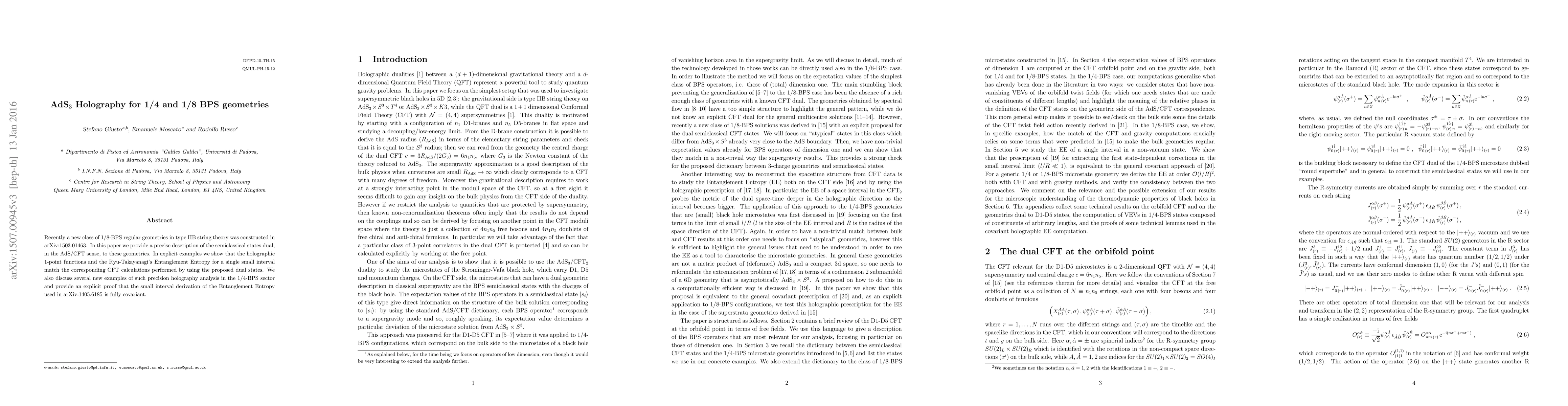 This paper examines semiclassical states in AdS3 holography that correspond to new 1/8-BPS geometries in type IIB string theory, confirming their dual CFT calculations via holographic 1-point functions and Ryu-Takayanagi entanglement entropy. It extends these findings to 1/4-BPS sectors and validates the covariant nature of small interval entanglement entropy derivations.