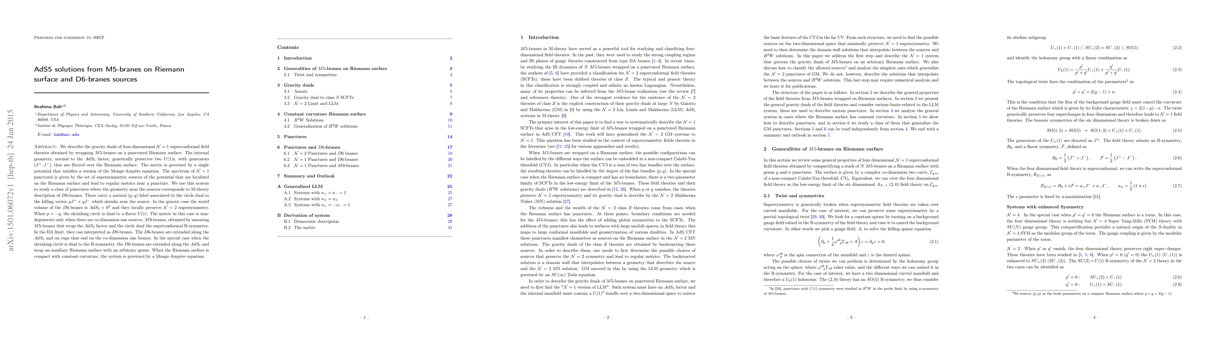 We describe the gravity duals of four-dimensional N=1 superconformal field theories obtained by wrapping M5-branes on a punctured Riemann surface. The internal geometry, normal to the AdS5 factor, generically preserves two U(1)s, with generators (J+,J-), that are fibered over the Riemann surface. The metric is governed by a single potential that satisfies a version of the Monge-Ampere equation. The spectrum of N=1 punctures is given by the set of supersymmetric sources of the potential that are localized on the Riemann surface and lead to regular metrics near a puncture. We use this system to study a class of punctures where the geometry near the sources corresponds to M-theory description of D6-branes. These carry a natural (p,q) label associated to the circle dual to the killing vector (p J+ + q J-) which shrinks near the source. In the generic case the world volume of the D6-branes is AdS5 X S^2 and they locally preserve N=2 supersymmetry. When p=-q, the shrinking circle is dual to a flavor U(1). The metric in this case is non-degenerate only when there are co-dimension one sources, M9-branes, obtained by smearing M5-branes that wrap the AdS5 factor and the circle dual the superconformal R-symmetry. In the IIA limit, they can interpreted as D8-branes. The D6-branes are extended along the AdS5 and on cups that end on the co-dimension one branes. In the special case when the shrinking circle is dual to the R-symmetry, the D6-branes are extended along the AdS5 and wrap an auxiliary Riemann surface with an arbitrary genus. When the Riemann surface is compact with constant curvature, the system is governed by a Monge-Ampere equation.
