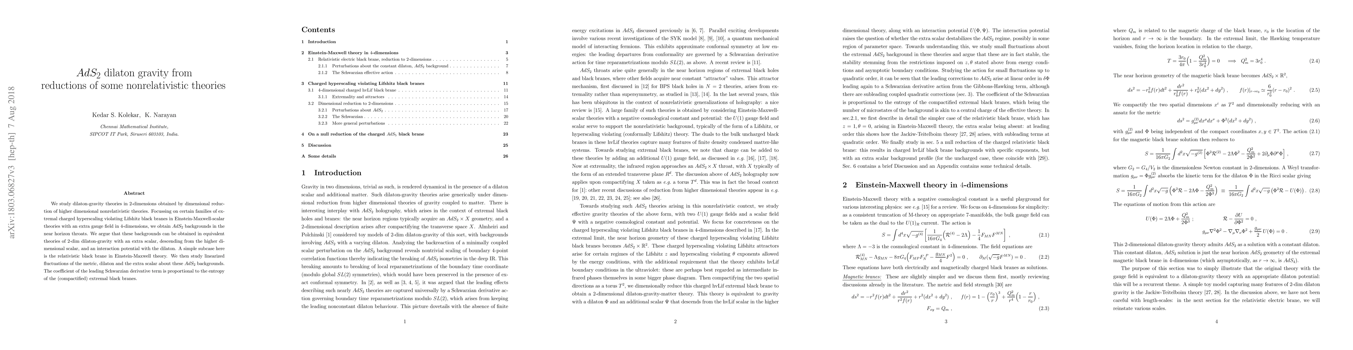 This paper explores 2-dimensional dilaton gravity theories derived from the dimensional reduction of higher-dimensional nonrelativistic theories, specifically focusing on extremal charged black branes. It finds that these reductions lead to $AdS_2$ backgrounds with an extra scalar and interaction potential, and analyzes the linearized fluctuations around these backgrounds, linking the leading Schwarzian derivative term to the entropy of the black branes.