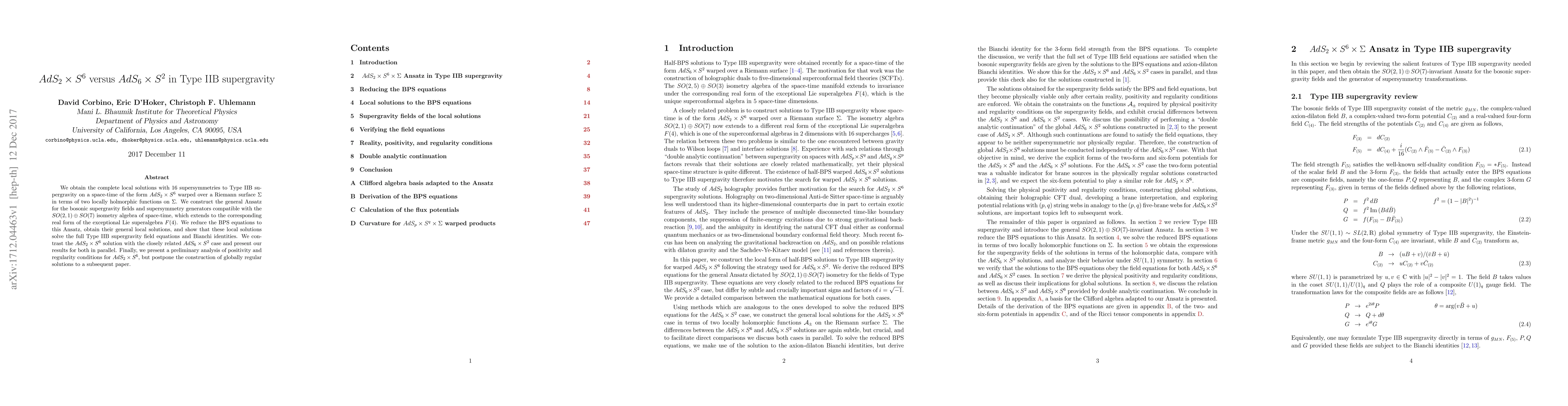 We obtain the complete local solutions with 16 supersymmetries to Type IIB supergravity on a space-time of the form $AdS_{2}\times S^{6}$ warped over a Riemann surface $\Sigma$ in terms of two locally holmorphic functions on $\Sigma$. We construct the general Ansatz for the bosonic supergravity fields and supersymmetry generators compatible with the $SO(2,1)\oplus SO(7)$ isometry algebra of space-time, which extends to the corresponding real form of the exceptional Lie superalgebra $F(4)$. We reduce the BPS equations to this Ansatz, obtain their general local solutions, and show that these local solutions solve the full Type IIB supergravity field equations and Bianchi identities. We contrast the $AdS_{2}\times S^{6}$ solution with the closely related $AdS_6\times S^2$ case and present our results for both in parallel. Finally, we present a preliminary analysis of positivity and regularity conditions for $AdS_{2}\times S^{6}$, but postpone the construction of globally regular solutions to a subsequent paper.