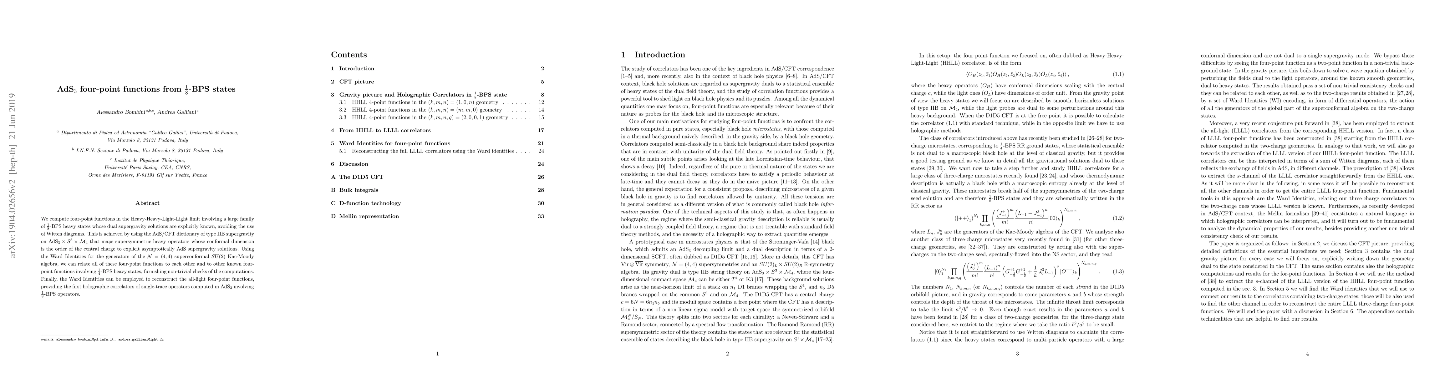 This paper computes four-point functions in AdS$_3$ for $\frac{1}{8}$-BPS states using the AdS/CFT correspondence, avoiding Witten diagrams. It employs Ward Identities from the ${\cal N}=(4,4)$ superconformal algebra to relate these functions and validate computations, providing the first holographic correlators of single-trace operators in AdS$_3$ involving $\frac{1}{8}$-BPS operators.