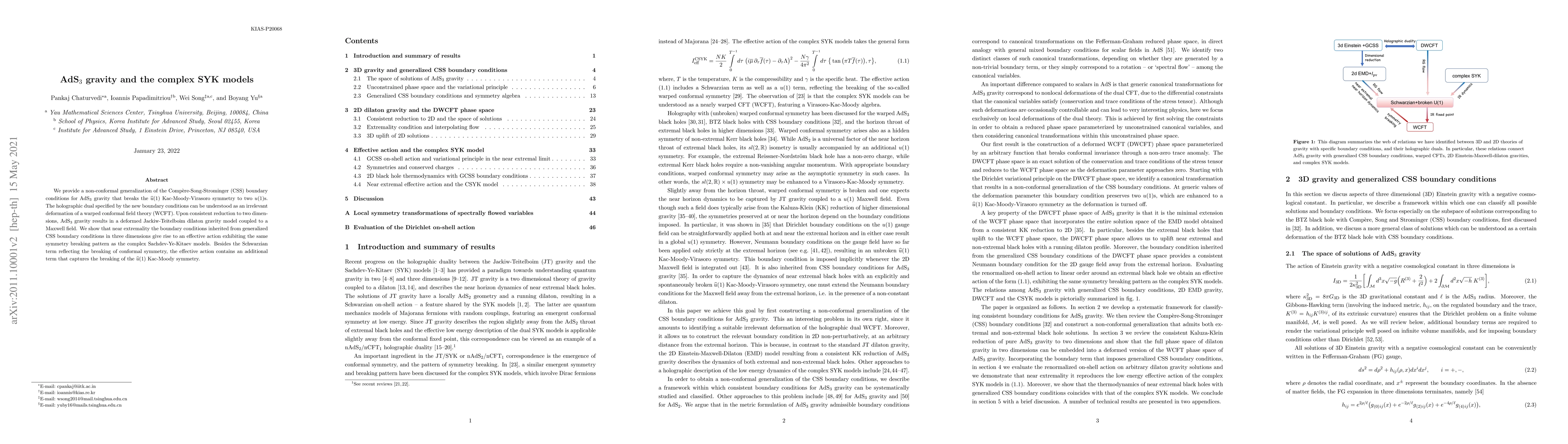 We provide a non conformal generalization of the Comp\`ere-Song-Strominger (CSS) boundary conditions for AdS$_3$ gravity that breaks the $\widehat u(1)$ Kac-Moody-Virasoro symmetry to two $u(1)$s. The holographic dual specified by the new boundary conditions can be understood as an irrelevant deformation of a warped conformal field theory (WCFT). Upon consistent reduction to two dimensions, AdS$_3$ gravity results in a deformed Jackiw-Teitelboim dilaton gravity model coupled to a Maxwell field. We show that near extremality the boundary conditions inherited from generalized CSS boundary conditions in three dimensions give rise to an effective action exhibiting the same symmetry breaking pattern as the complex Sachdev-Ye-Kitaev models. Besides the Schwarzian term reflecting the breaking of conformal symmetry, the effective action contains an additional term that captures the breaking of the $\widehat u(1)$ Kac-Moody symmetry.