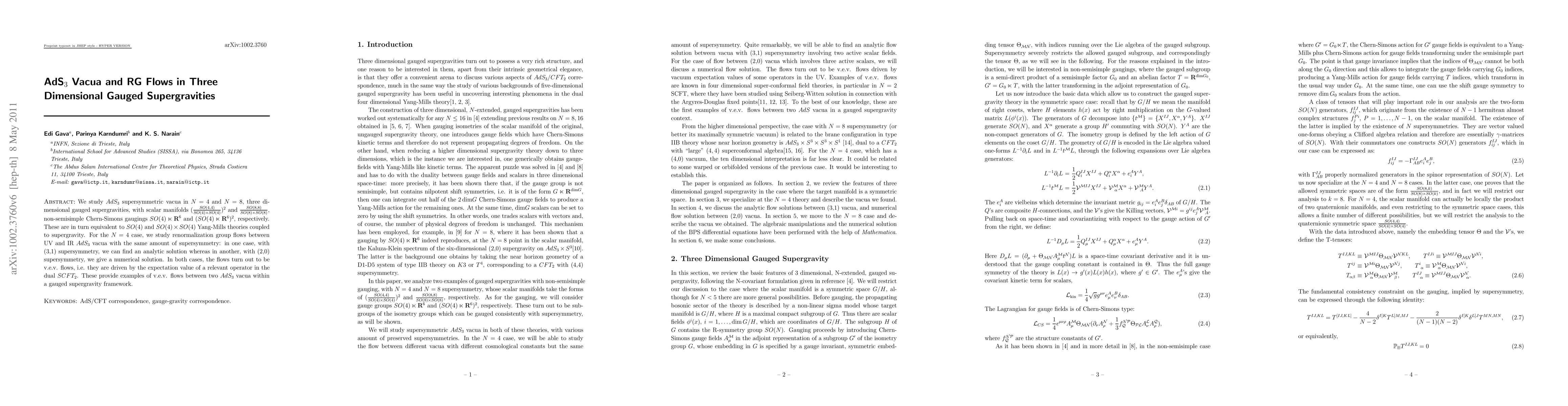 This paper investigates $AdS_3$ supersymmetric vacua in N=4 and N=8 three-dimensional gauged supergravities, focusing on renormalization group flows between these vacua. It provides analytic and numerical solutions for flows driven by the expectation value of relevant operators in the dual two-dimensional conformal field theories.