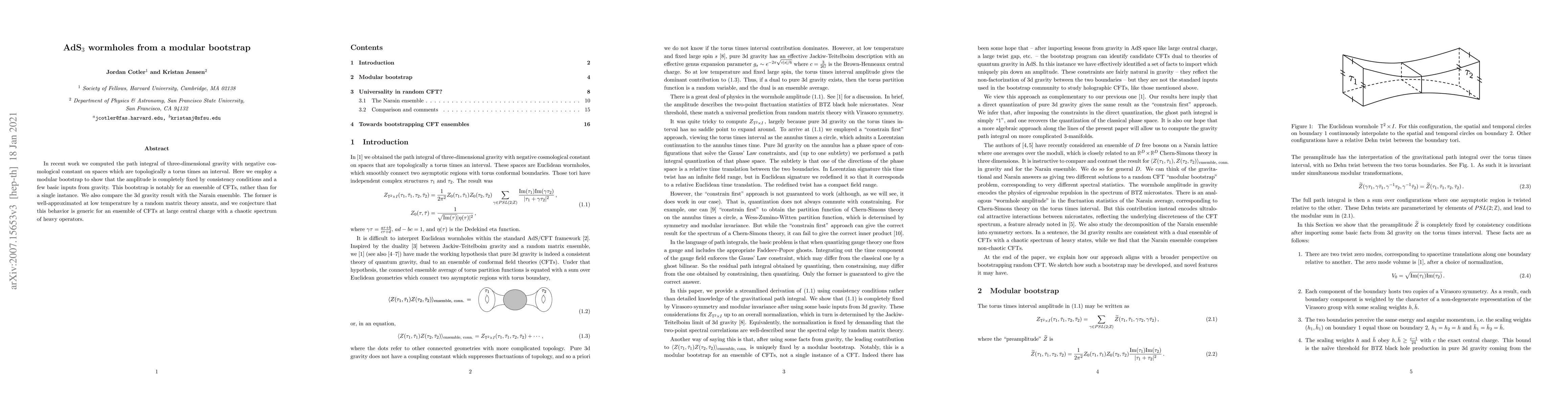 This paper uses a modular bootstrap to determine the path integral amplitude for three-dimensional gravity on torus-times-interval spaces, showing it is entirely governed by consistency conditions and basic gravity inputs. It compares this with the Narain ensemble, proposing that low-temperature behavior approximates random matrix theory for ensembles of CFTs with large central charge and chaotic spectra.
