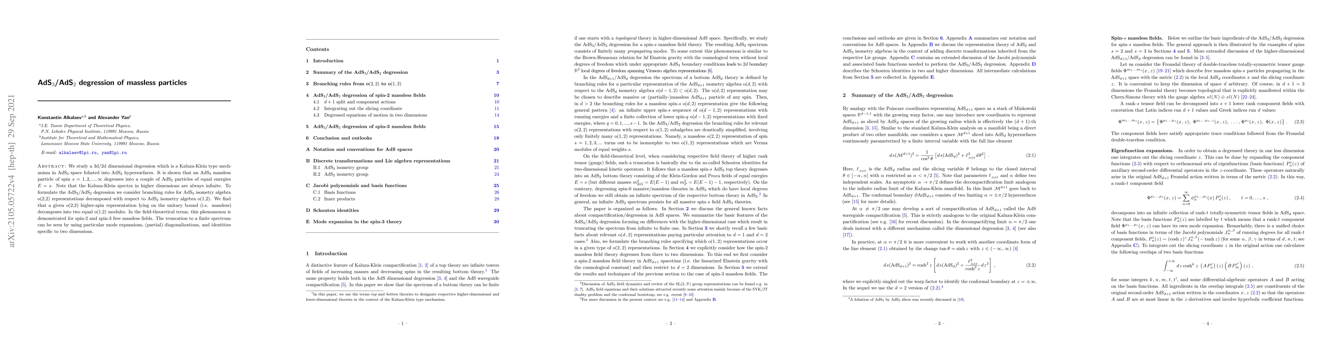 We study a 3d/2d dimensional degression which is a Kaluza-Klein type mechanism in AdS$_3$ space foliated into AdS$_2$ hypersurfaces. It is shown that an AdS$_3$ massless particle of spin $s=1,2,...,\infty$ degresses into a couple of AdS$_2$ particles of equal energies $E=s$. Note that the Kaluza-Klein spectra in higher dimensions are always infinite. To formulate the AdS$_3$/AdS$_2$ degression we consider branching rules for AdS$_3$ isometry algebra o$(2,2)$ representations decomposed with respect to AdS$_2$ isometry algebra o$(1,2)$. We find that a given o$(2,2)$ higher-spin representation lying on the unitary bound (i.e. massless) decomposes into two equal o$(1,2)$ modules. In the field-theoretical terms, this phenomenon is demonstrated for spin-2 and spin-3 free massless fields. The truncation to a finite spectrum can be seen by using particular mode expansions, (partial) diagonalizations, and identities specific to two dimensions.