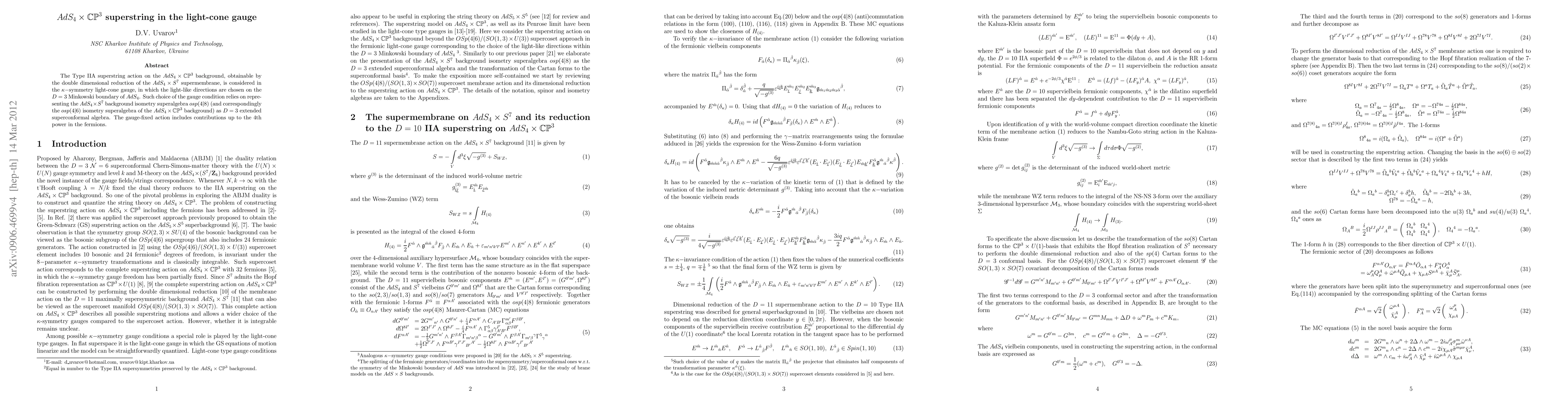 The Type IIA superstring action on the AdS_4 x CP^3 background, obtainable by the double dimensional reduction of the AdS_4 x S^7 supermembrane, is considered in the kappa-symmetry light-cone gauge, in which the light-like directions are chosen on the D=3 Minkowski boundary of AdS_4. Such choice of the gauge condition relies on representing the AdS_4 x S^7 background isometry superalgebra osp(4|8) (and correspondingly the osp(4|6) isometry superalgebra of the AdS_4 x CP^3 background) as D=3 extended superconformal algebra. The gauge-fixed action includes contributions up to the 4th power in the fermions.