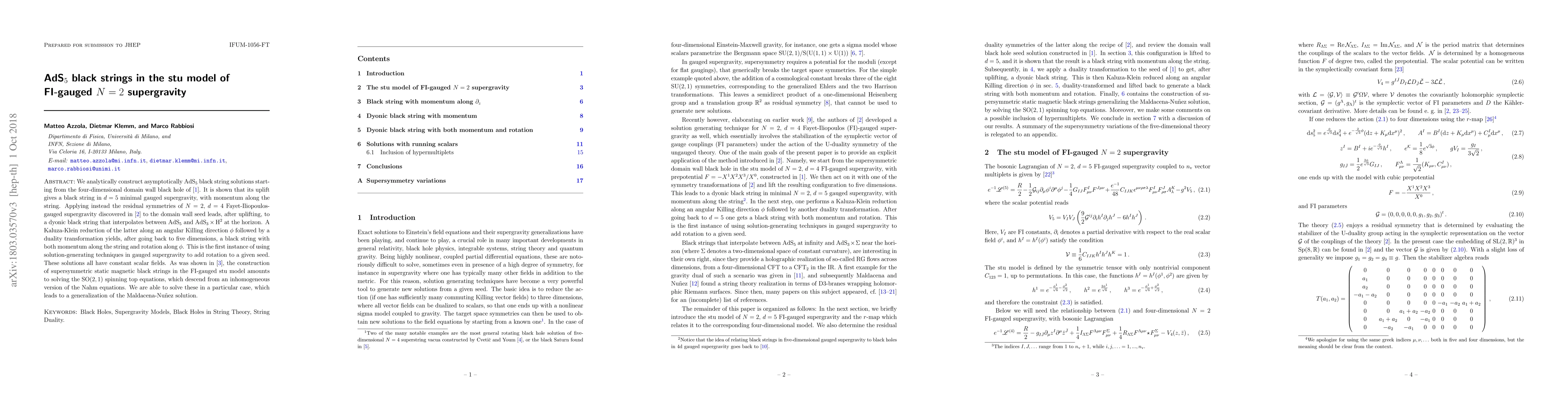 We analytically construct asymptotically AdS$_5$ black string solutions starting from the four-dimensional domain wall black hole of arXiv:0911.4926. It is shown that its uplift gives a black string in $d=5$ minimal gauged supergravity, with momentum along the string. Applying instead the residual symmetries of $N=2$, $d=4$ Fayet-Iliopoulos-gauged supergravity discovered in arXiv:1606.05160 to the domain wall seed leads, after uplifting, to a dyonic black string that interpolates between AdS$_5$ and $\text{AdS}_3\times\text{H}^2$ at the horizon. A Kaluza-Klein reduction of the latter along an angular Killing direction $\phi$ followed by a duality transformation yields, after going back to five dimensions, a black string with both momentum along the string and rotation along $\phi$. This is the first instance of using solution-generating techniques in gauged supergravity to add rotation to a given seed. These solutions all have constant scalar fields. As was shown in hep-th/0302218, the construction of supersymmetric static magnetic black strings in the FI-gauged stu model amounts to solving the $\text{SO}(2,1)$ spinning top equations, which descend from an inhomogeneous version of the Nahm equations. We are able to solve these in a particular case, which leads to a generalization of the Maldacena-Nu\~nez solution.