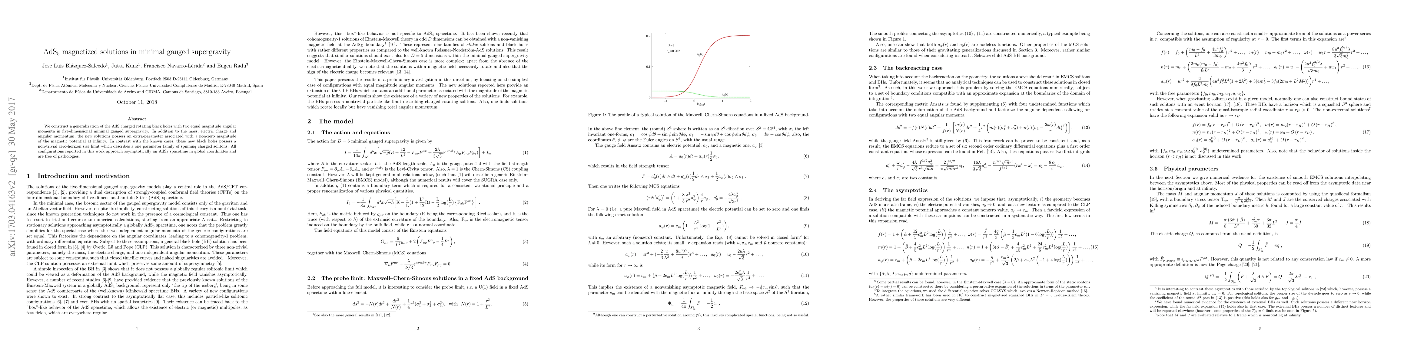 We construct a generalization of the AdS charged rotating black holes with two equal magnitude angular momenta in five-dimensional minimal gauged supergravity. In addition to the mass, electric charge and angular momentum, the new solutions possess an extra-parameter associated with a non-zero magnitude of the magnetic potential at infinity. In contrast with the known cases, these new black holes possess a non-trivial zero-horizon size limit which describes a one parameter family of spinning charged solitons. All configurations reported in this work approach asymptotically an AdS$_5$ spacetime in global coordinates and are free of pathologies.