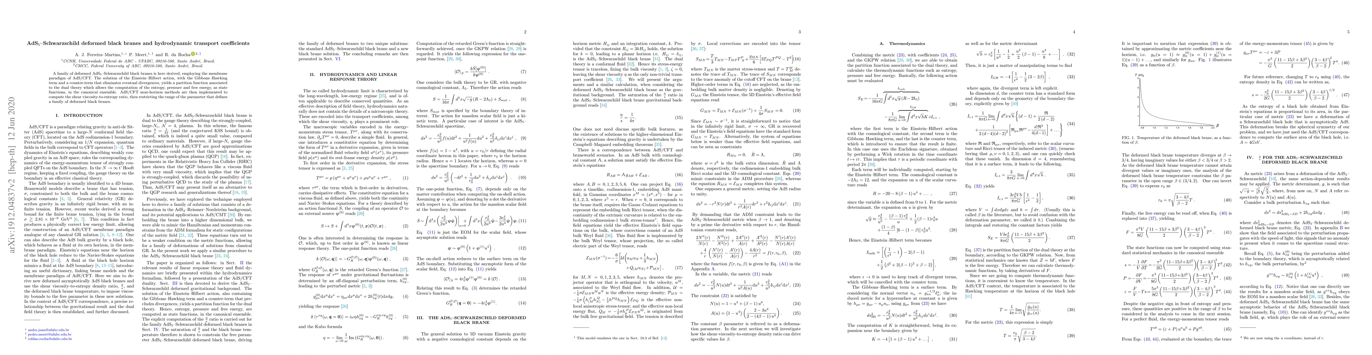 The paper derives a family of deformed AdS$_5$-Schwarzschild black branes using the membrane paradigm in AdS/CFT, and computes entropy, pressure, and free energy. It also calculates the shear viscosity-to-entropy ratio via AdS/CFT near-horizon methods.