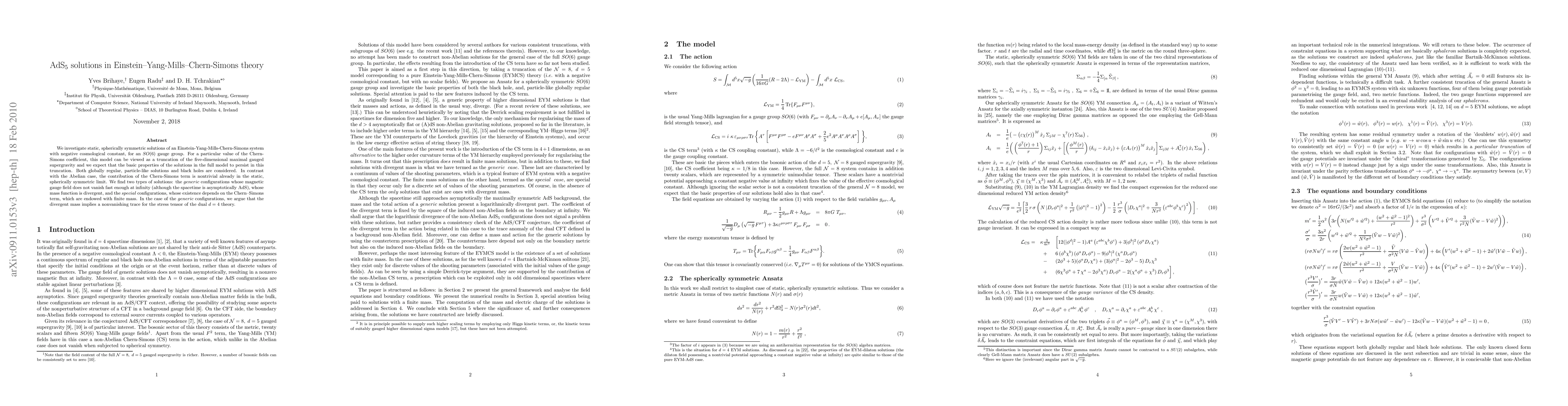 This paper explores static, spherically symmetric solutions in an Einstein-Yang-Mills-Chern-Simons system with a negative cosmological constant for an SO(6) gauge group, identifying two types of solutions: divergent mass generic configurations and finite mass special configurations dependent on the Chern-Simons term.