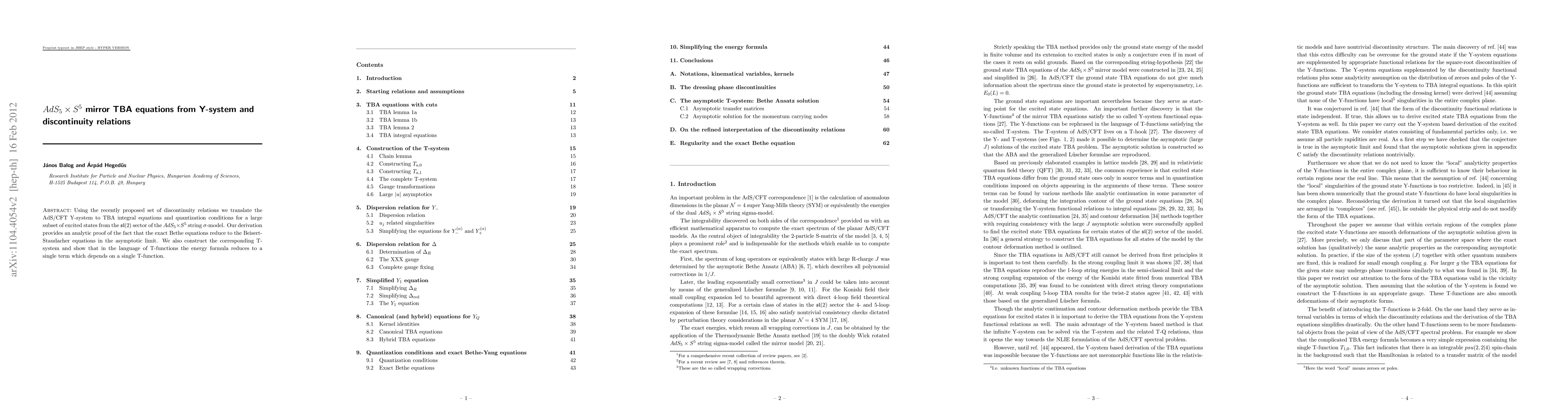 This paper translates the AdS/CFT Y-system into thermodynamic Bethe ansatz (TBA) equations and quantization conditions for excited states in the $AdS_5 \times S^5$ string sigma-model's sl(2) sector. It provides an analytic proof that exact Bethe equations converge to the Beisert-Staudacher equations in the asymptotic limit.