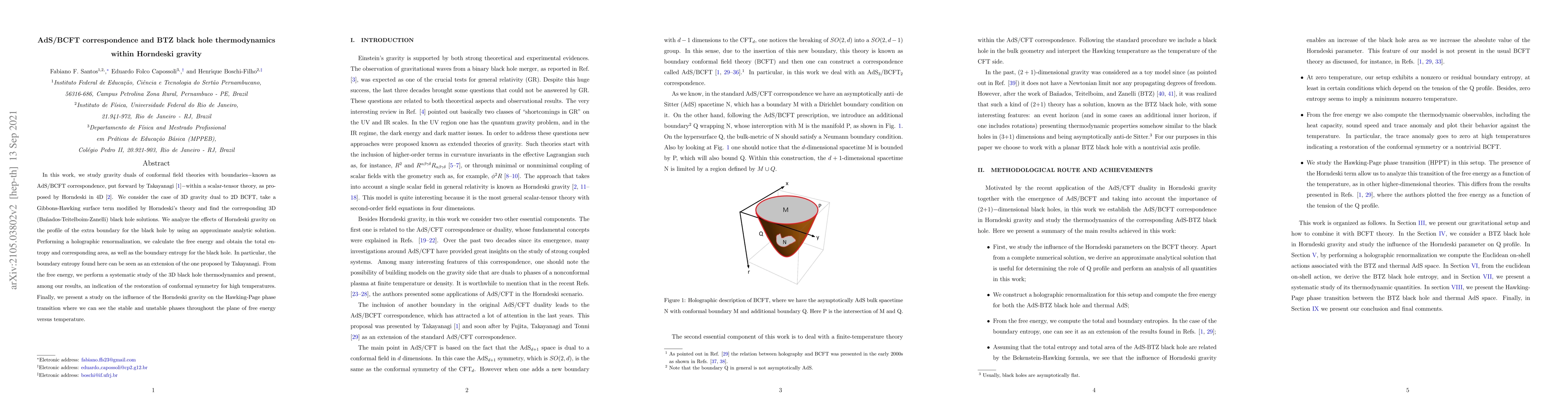 In this work, we study gravity duals of conformal field theories with boundaries known as AdS/BCFT correspondence, put forward by Takayanagi [1], within a scalar-tensor theory, as proposed by Horndeski in 4D [2]. We consider the case of 3D gravity dual to 2D BCFT, take a Gibbons-Hawking surface term modified by Horndeski's theory and find the corresponding 3D (BTZ) black hole solutions. We analyze the effects of Horndeski's gravity on the profile of the extra boundary for the black hole by using an approximate analytic solution. Performing a holographic renormalization, we have calculated the free energy and obtained the total entropy and the corresponding area, as well as the boundary entropy for the black hole. In particular, the boundary entropy found here, can be seen as an extension of the one proposed by Takayanagi. From the free energy, we have done a systematic study of the 3D black hole thermodynamics and present, among our results, an indication of restoration of conformal symmetry for high temperatures. Finally, we present a study on the influence of the Horndeski's gravity on the Hawking-Page phase transition where we can see the stable and unstable phases throughout the plane of free energy {\sl versus} temperature.