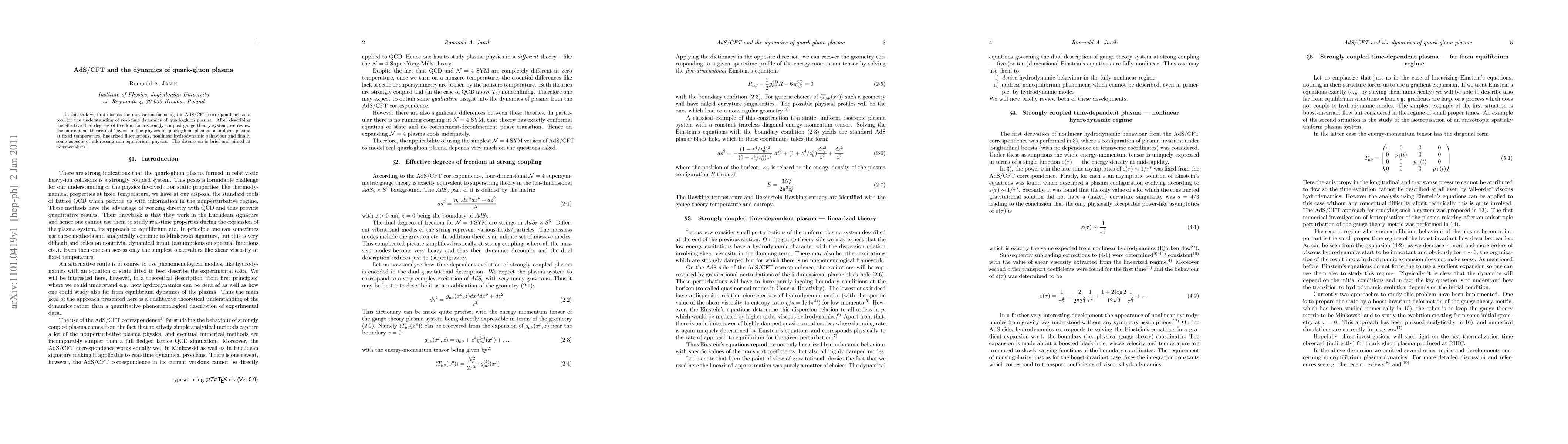 In this talk we first discuss the motivation for using the AdS/CFT correspondence as a tool for the understanding of real-time dynamics of quark-gluon plasma. After describing the effective dual degrees of freedom for a strongly coupled gauge theory system, we review the subsequent theoretical `layers' in the physics of quark-gluon plasma: a uniform plasma at fixed temperature, linearized fluctuations, nonlinear hydrodynamic behaviour and finally some aspects of addressing non-equilibrium physics. The discussion is brief and aimed at nonspecialists.