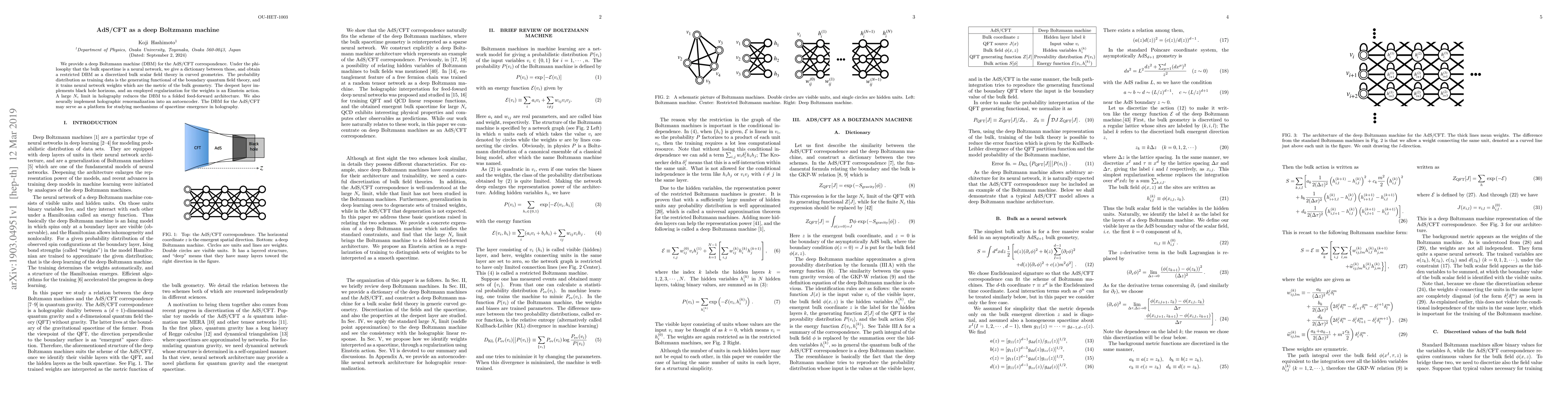 We provide a deep Boltzmann machine (DBM) for the AdS/CFT correspondence. Under the philosophy that the bulk spacetime is a neural network, we give a dictionary between those, and obtain a restricted DBM as a discretized bulk scalar field theory in curved geometries. The probability distribution as training data is the generating functional of the boundary quantum field theory, and it trains neural network weights which are the metric of the bulk geometry. The deepest layer implements black hole horizons, and an employed regularization for the weights is an Einstein action. A large $N_c$ limit in holography reduces the DBM to a folded feed-forward architecture. We also neurally implement holographic renormalization into an autoencoder. The DBM for the AdS/CFT may serve as a platform for studying mechanisms of spacetime emergence in holography.