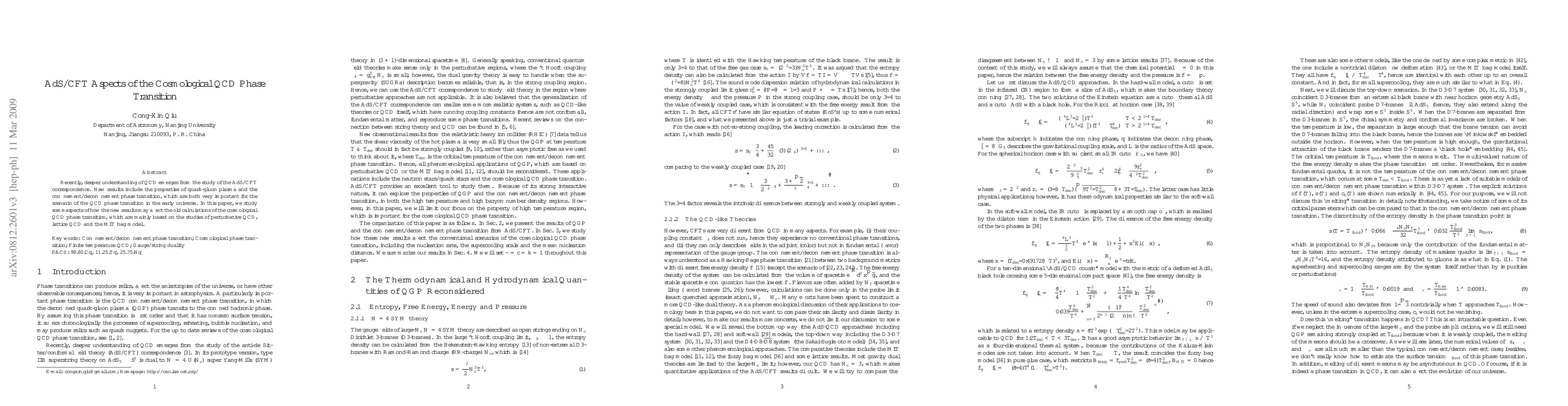 This paper examines how recent insights from the AdS/CFT correspondence influence our understanding of the cosmological QCD phase transition, comparing new findings on quark-gluon plasma and confinement/deconfinement with traditional calculations based on perturbative QCD, lattice QCD, and the MIT bag model.