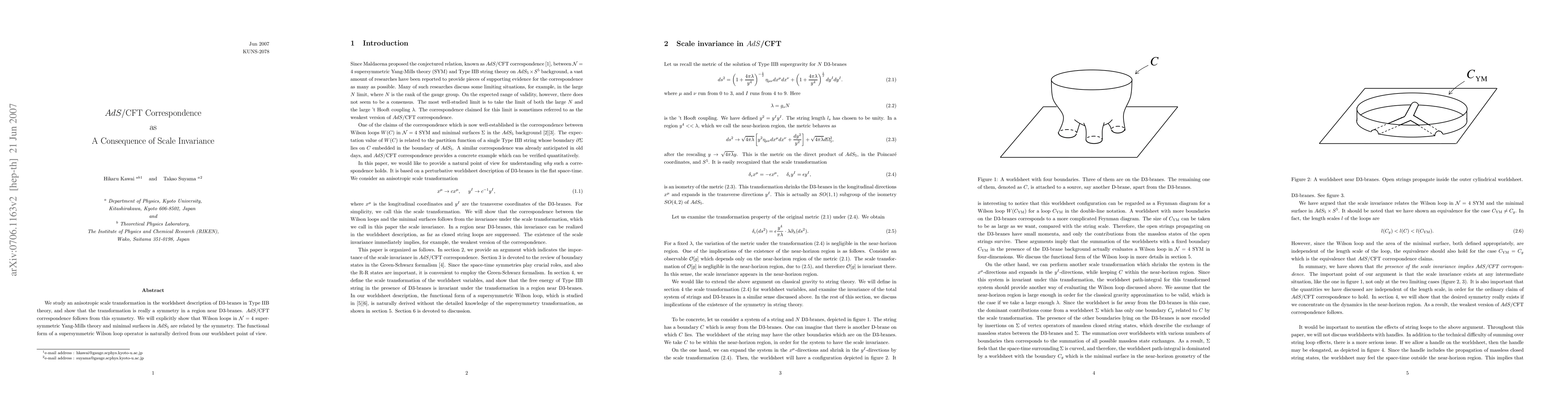 The paper demonstrates that an anisotropic scale transformation in D3-branes' worldsheet description reveals a symmetry near the branes, leading to the AdS/CFT correspondence. It explicitly connects Wilson loops in N=4 supersymmetric Yang-Mills theory with minimal surfaces in AdS_5 through this symmetry.