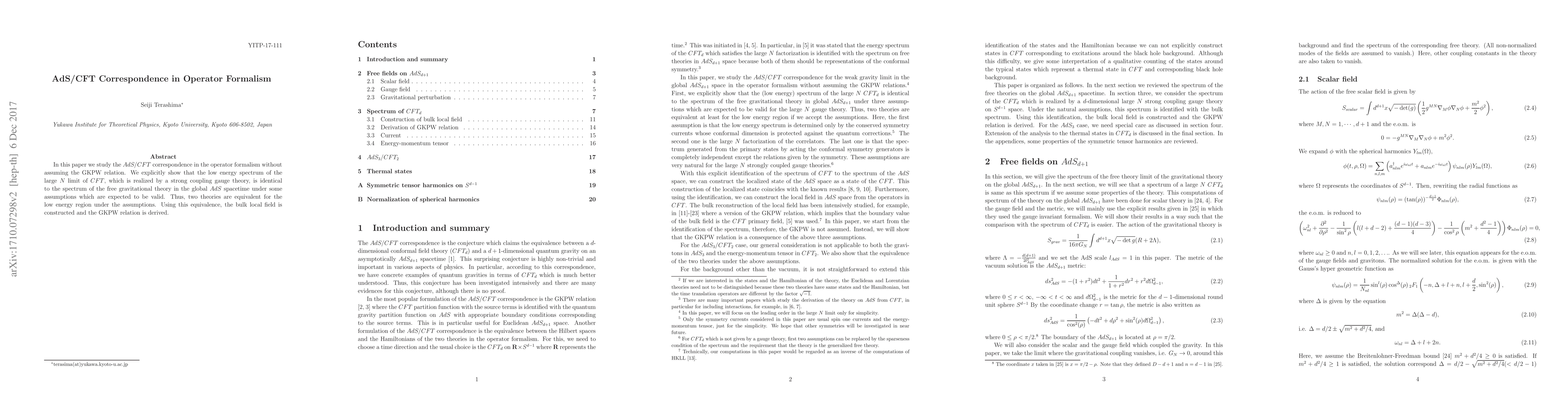 This paper explores the AdS/CFT correspondence in operator formalism without relying on the GKPW relation, demonstrating equivalence between the low energy spectrum of a large N limit CFT and the free gravitational theory in global AdS spacetime. The bulk local field is constructed, leading to the derivation of the GKPW relation.