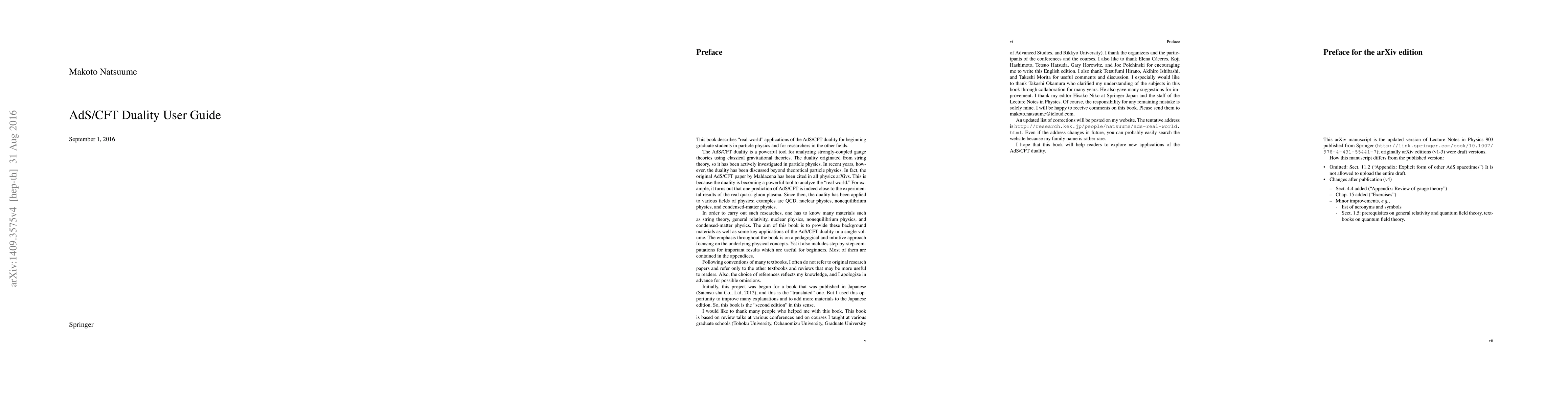 This is the draft/updated version of a textbook on "real-world" applications of the AdS/CFT duality for beginning graduate students in particle physics and for researchers in the other fields. The aim of this book is to provide background materials such as string theory, general relativity, nuclear physics, nonequilibrium physics, and condensed-matter physics as well as some key applications of the AdS/CFT duality in a single textbook. Contents: (1) Introduction, (2) General relativity and black holes, (3) Black holes and thermodynamics, (4) Strong interaction and gauge theories, (5) The road to AdS/CFT, (6) The AdS spacetime, (7) AdS/CFT - equilibrium, (8) AdS/CFT - adding probes, (9) Basics of nonequilibrium physics, (10) AdS/CFT - nonequilibrium, (11) Other AdS spacetimes, (12) Applications to quark-gluon plasma, (13) Basics of phase transition, (14) AdS/CFT - phase transition, (15) Exercises.