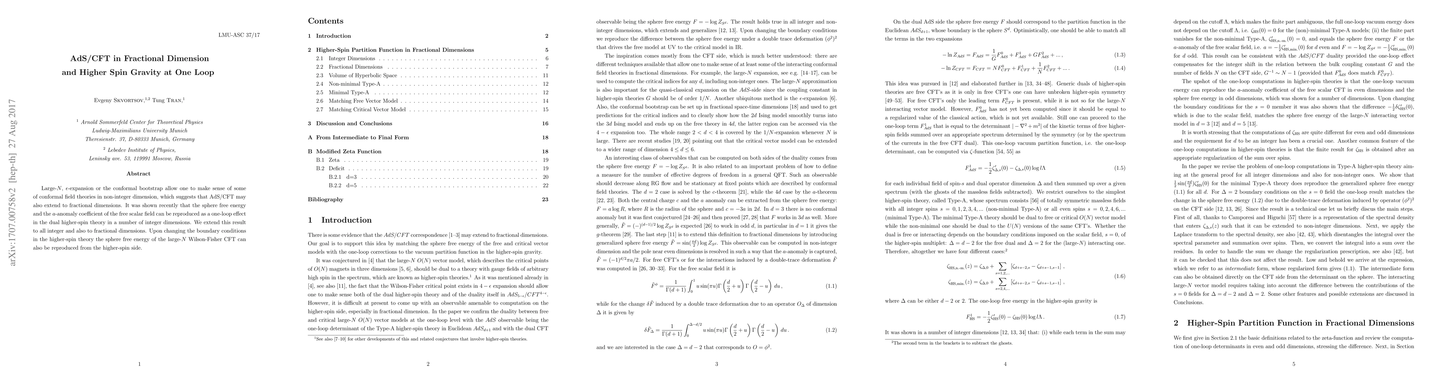 This paper extends the AdS/CFT correspondence to fractional dimensions, demonstrating that the one-loop effects in a higher-spin theory can reproduce the sphere free energy and $a$-anomaly coefficient for both integer and fractional dimensions. It also shows that altering boundary conditions in the higher-spin theory can match the sphere free energy of the large-$N$ Wilson-Fisher CFT.