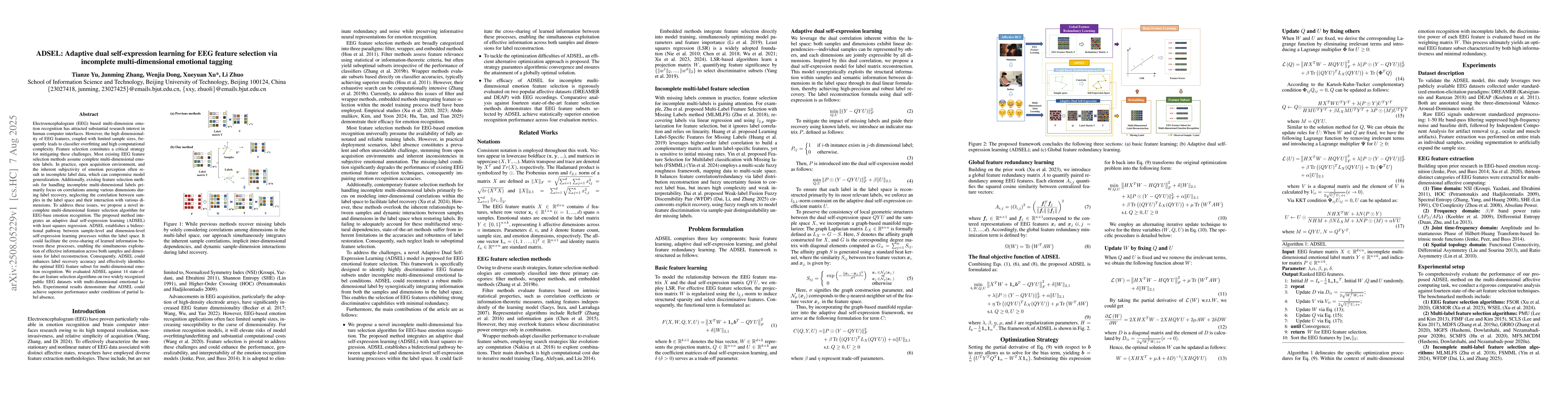 EEG based multi-dimension emotion recognition has attracted substantial research interest in human computer interfaces. However, the high dimensionality of EEG features, coupled with limited sample sizes, frequently leads to classifier overfitting and high computational complexity. Feature selection constitutes a critical strategy for mitigating these challenges. Most existing EEG feature selection methods assume complete multi-dimensional emotion labels. In practice, open acquisition environment, and the inherent subjectivity of emotion perception often result in incomplete label data, which can compromise model generalization. Additionally, existing feature selection methods for handling incomplete multi-dimensional labels primarily focus on correlations among various dimensions during label recovery, neglecting the correlation between samples in the label space and their interaction with various dimensions. To address these issues, we propose a novel incomplete multi-dimensional feature selection algorithm for EEG-based emotion recognition. The proposed method integrates an adaptive dual self-expression learning (ADSEL) with least squares regression. ADSEL establishes a bidirectional pathway between sample-level and dimension-level self-expression learning processes within the label space. It could facilitate the cross-sharing of learned information between these processes, enabling the simultaneous exploitation of effective information across both samples and dimensions for label reconstruction. Consequently, ADSEL could enhances label recovery accuracy and effectively identifies the optimal EEG feature subset for multi-dimensional emotion recognition.