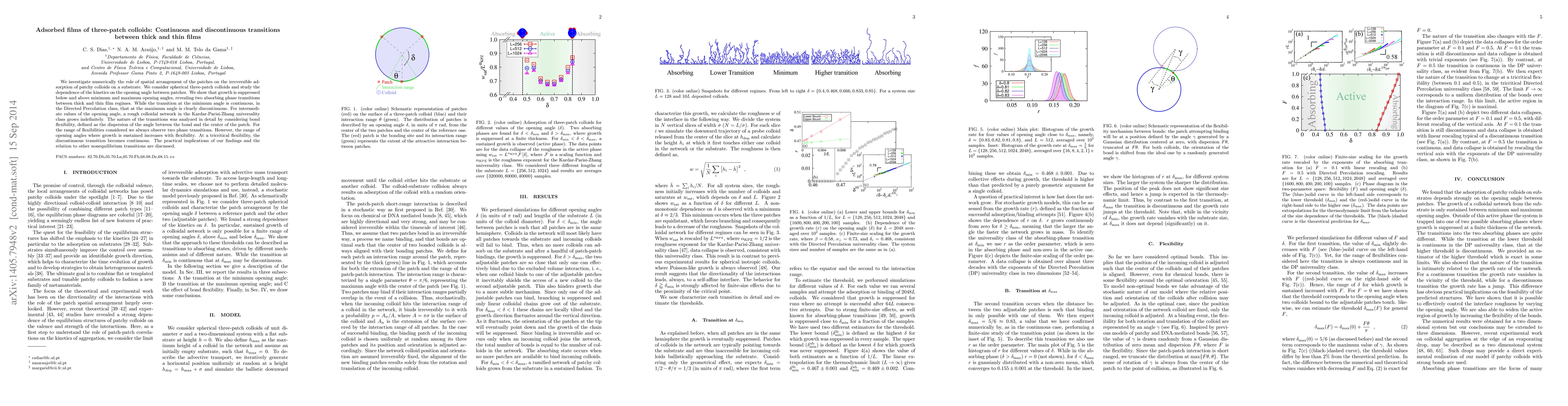 This paper explores the adsorption dynamics of three-patch colloids on a substrate, revealing continuous and discontinuous phase transitions between thick and thin film regimes based on patch opening angles. The study finds that flexibility in bond angles influences the transition types, with implications for understanding nonequilibrium systems.
