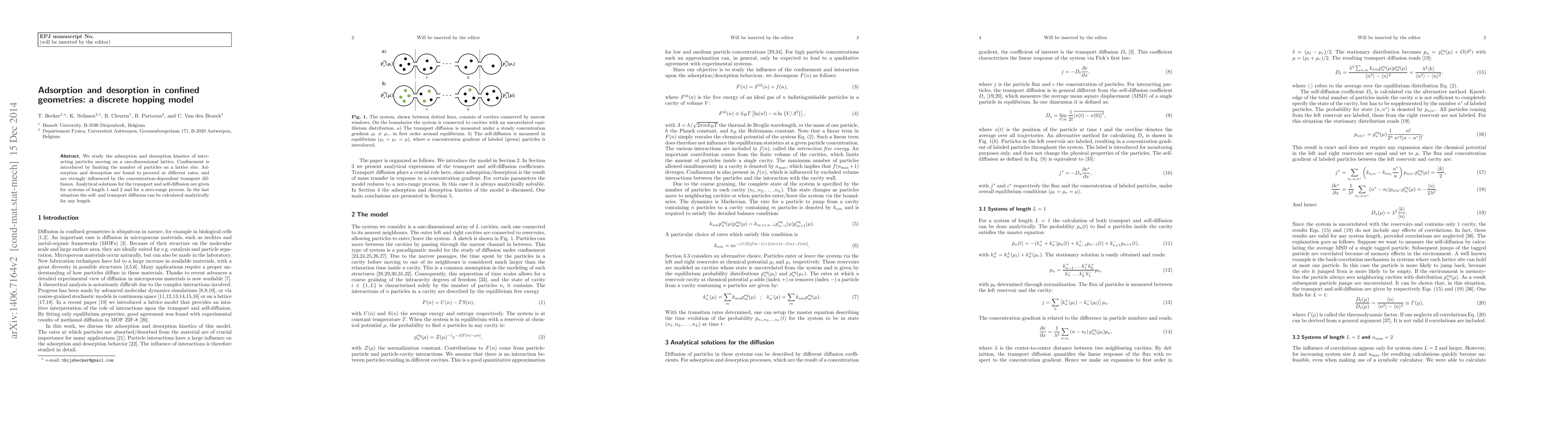 The research employs a one-dimensional lattice model to study adsorption and desorption kinetics in confined geometries, using a discrete hopping model. Analytical solutions are derived for systems of length 1 and 2, and for a zero-range process (ZRP) where transport and self-diffusion can be calculated for any length.