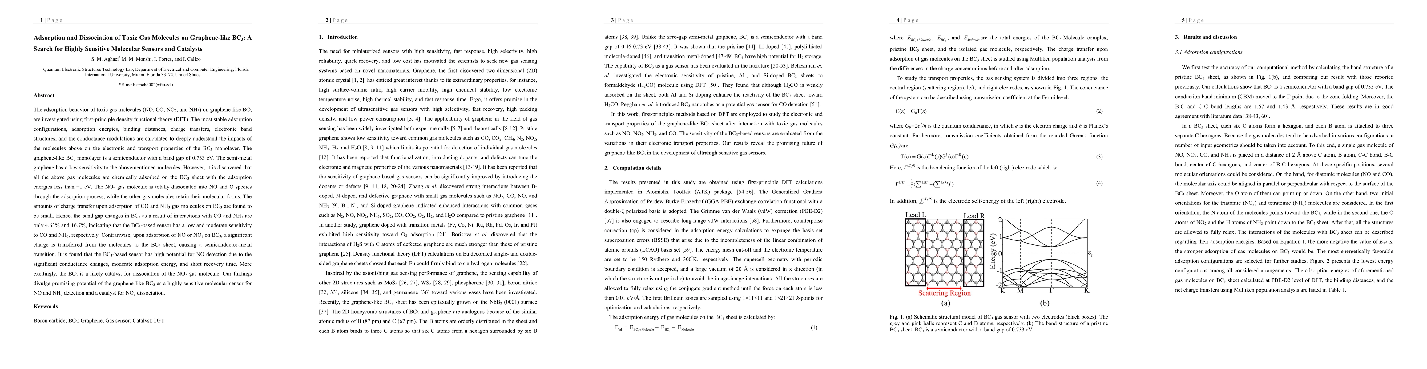 This research uses density functional theory to study the adsorption and dissociation of toxic gas molecules (NO, CO, NO2, NH3) on graphene-like BC3, revealing high sensitivity for NO detection and potential catalysis for NO2 dissociation due to significant charge transfer and conductance changes. BC3 shows moderate sensitivity for CO and NH3 detection.