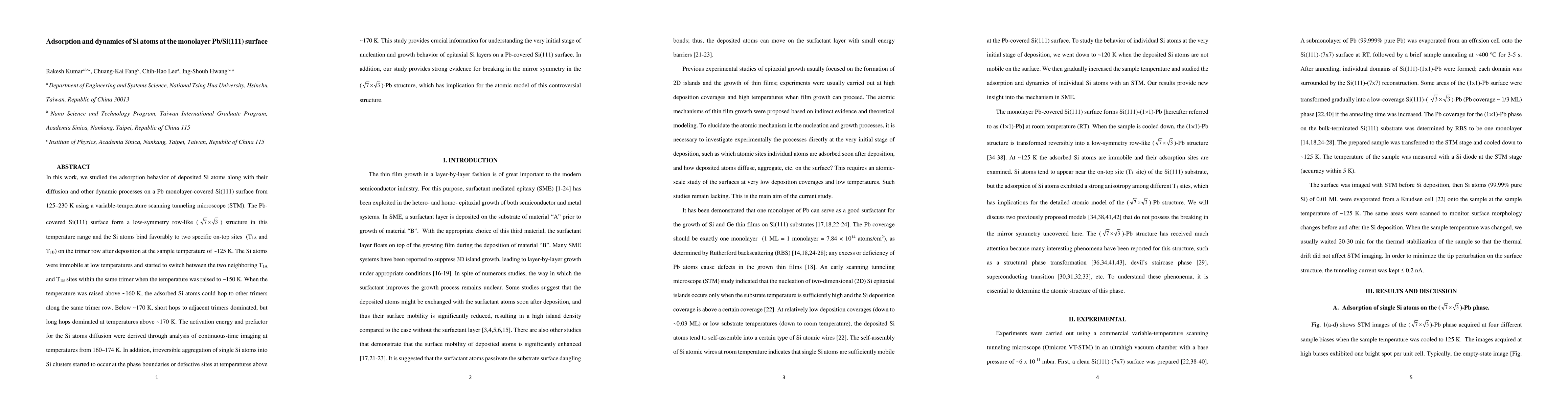 This research investigates the adsorption and dynamic behavior of Si atoms on a Pb monolayer-covered Si(111) surface using a variable-temperature scanning tunneling microscope. Si atoms favor specific on-top sites (T1A and T1B) within trimer rows and exhibit temperature-dependent diffusion, with hopping between trimers and irreversible aggregation into clusters above 170 K. The findings provide insights into the nucleation and growth of epitaxial Si layers and reveal symmetry breaking in the Pb-covered structure.
