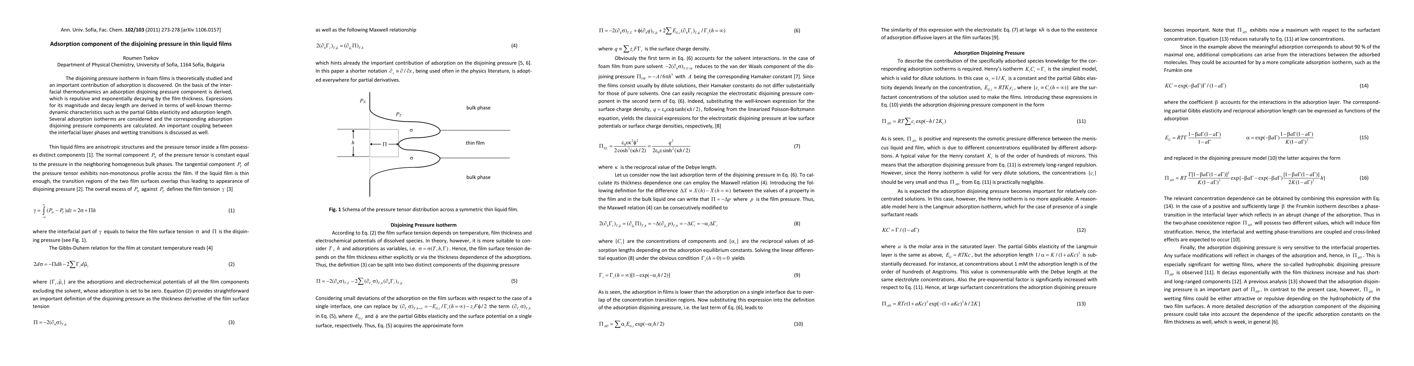 The paper derives a repulsive adsorption disjoining pressure component in foam films, which decays exponentially with film thickness, and discusses its thermodynamic characteristics and implications for interfacial layer phases and wetting transitions. The study considers various adsorption isotherms to calculate corresponding pressure components.