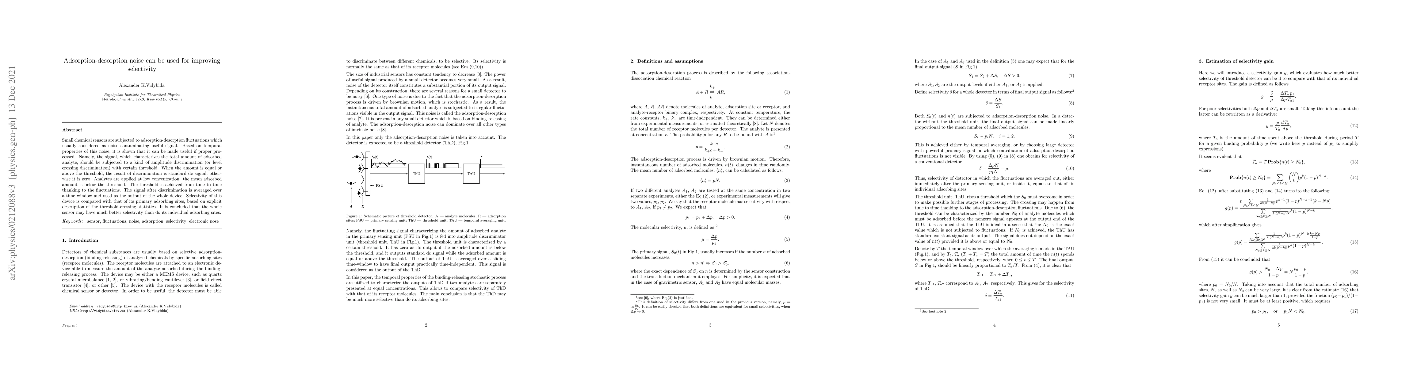 Small chemical sensors are subjected to adsorption-desorption fluctuations which usually considered as noise contaminating useful signal. Based on temporal properties of this noise, it is shown that it can be made useful if proper processed. Namely, the signal, which characterizes the total amount of adsorbed analyte, should be subjected to a kind of amplitude discrimination (or level crossing discrimination) with certain threshold. When the amount is equal or above the threshold, the result of discrimination is standard dc signal, otherwise it is zero. Analytes are applied at low concentration: the mean adsorbed amount is below the threshold. The threshold is achieved from time to time thanking to the fluctuations. The signal after discrimination is averaged over a time window and used as the output of the whole device. Selectivity of this device is compared with that of its primary adsorbing sites, based on explicit description of the threshold-crossing statistics. It is concluded that the whole sensor may have much better selectivity than do its individual adsorbing sites.