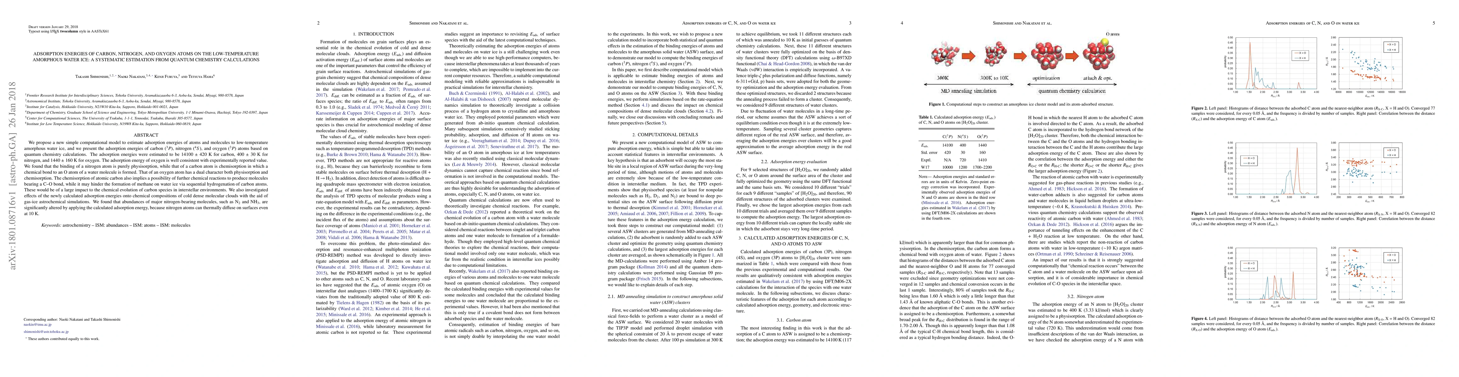This paper proposes a computational model to estimate adsorption energies of carbon, nitrogen, and oxygen atoms on low-temperature amorphous water ice, finding chemisorption for carbon and dual character for oxygen, while nitrogen binds purely through physisorption. The calculated adsorption energies significantly alter the abundances of nitrogen-bearing molecules in cold dense molecular clouds.