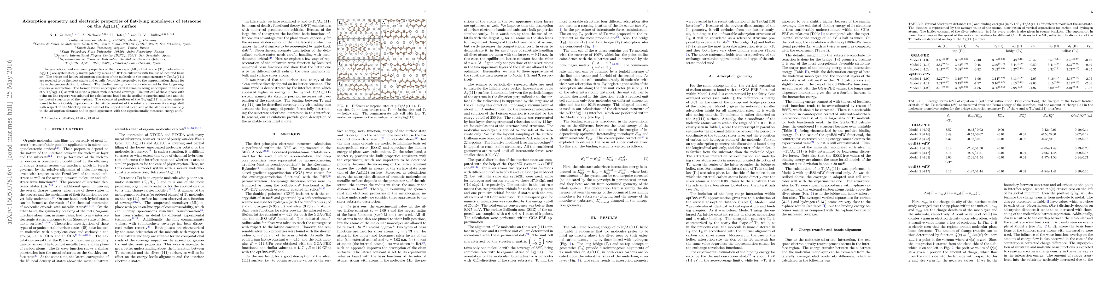 Researchers studied the properties of tetracene molecules on silver surfaces using DFT calculations, finding that a specific adsorption position is the most stable and equally favorable for either orientation, with binding energy determined by long-range interactions.