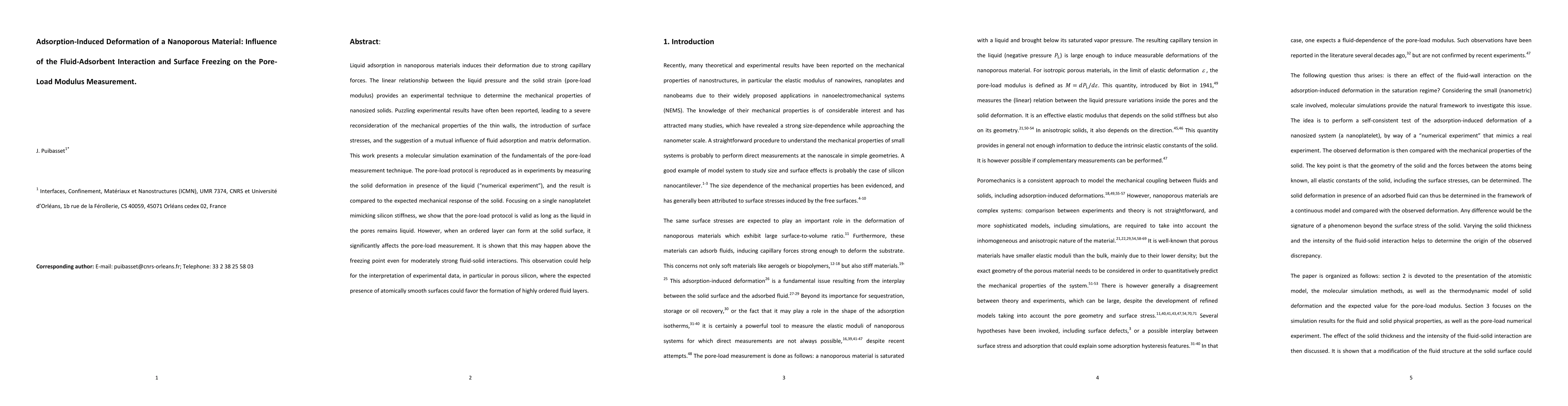 Liquid adsorption in nanoporous materials induces their deformation due to strong capillary forces. The linear relationship between the liquid pressure and the solid strain (pore-load modulus) provides an experimental technique to determine the mechanical properties of nanosized solids. Puzzling experimental results have often been reported, leading to a severe reconsideration of the mechanical properties of the thin walls, the introduction of surface stresses, and the suggestion of a mutual influence of fluid adsorption and matrix deformation. This work presents a molecular simulation examination of the fundamentals of the pore-load measurement technique. The pore-load protocol is reproduced as in experiments by measuring the solid deformation in presence of the liquid ("numerical experiment"), and the result is compared to the expected mechanical response of the solid. Focusing on a single nanoplatelet mimicking silicon stiffness, we show that the pore-load protocol is valid as long as the liquid in the pores remains liquid. However, when an ordered layer can form at the solid surface, it significantly affects the pore-load measurement. It is shown that this may happen above the freezing point even for moderately strong fluid-solid interactions. This observation could help for the interpretation of experimental data, in particular in porous silicon, where the expected presence of atomically smooth surfaces could favor the formation of highly ordered fluid layers.